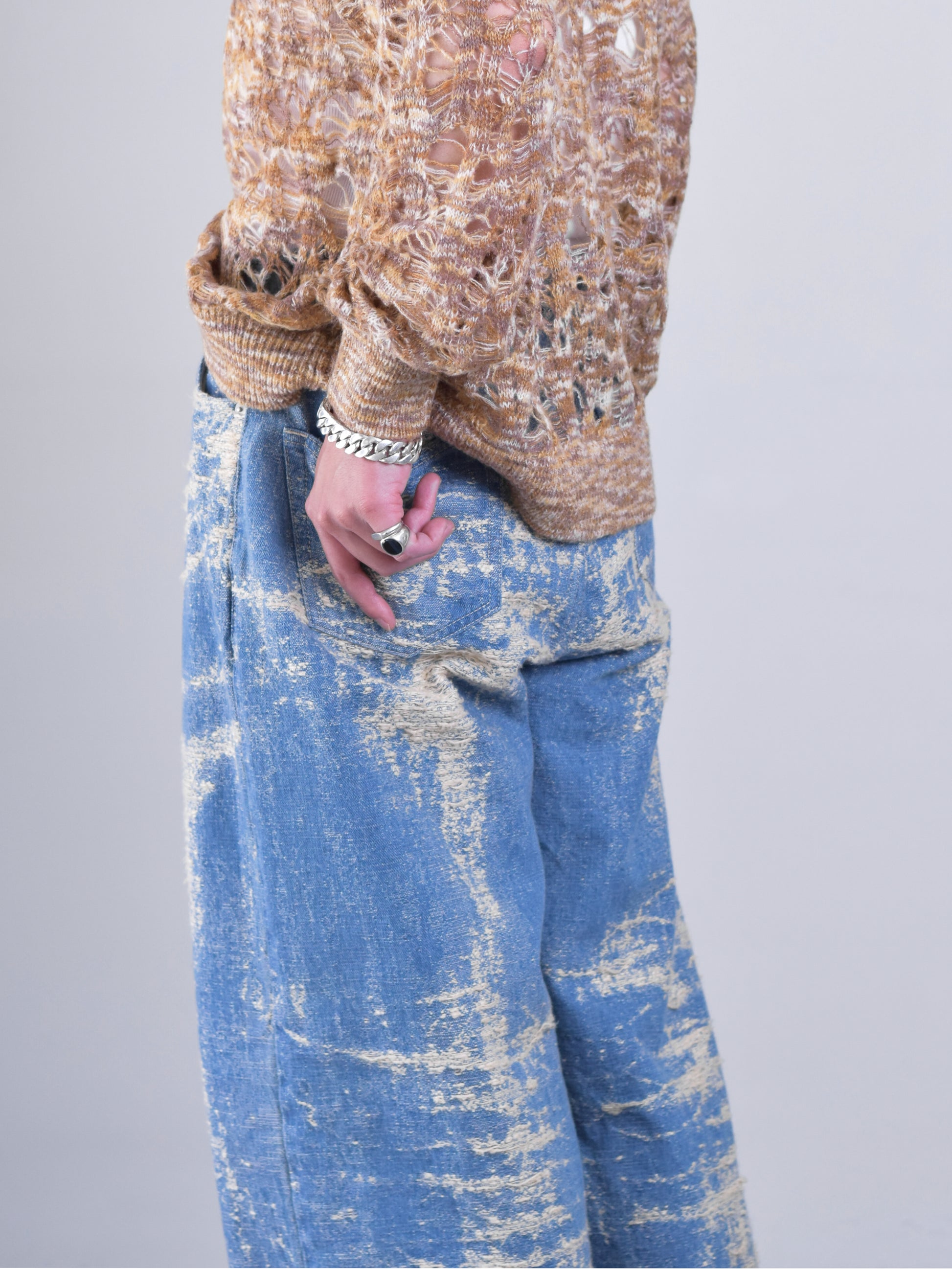 デニムにおいて自然に出てくるヒゲなどのアタリを柄データとして生地にジャガードで織り込んだ上に、ブリーチ加工を施し、新しいデニムの表情が可能となりました。