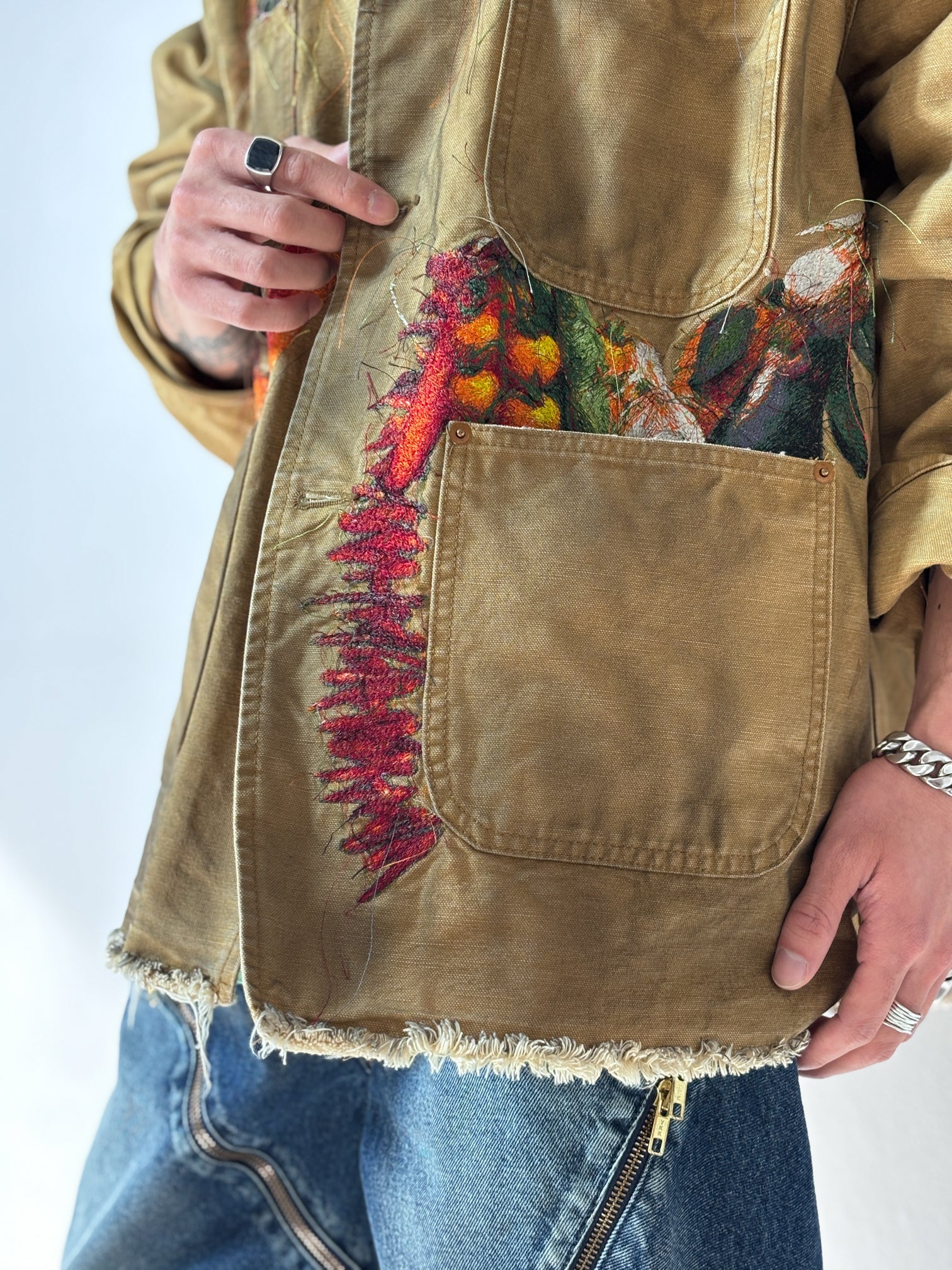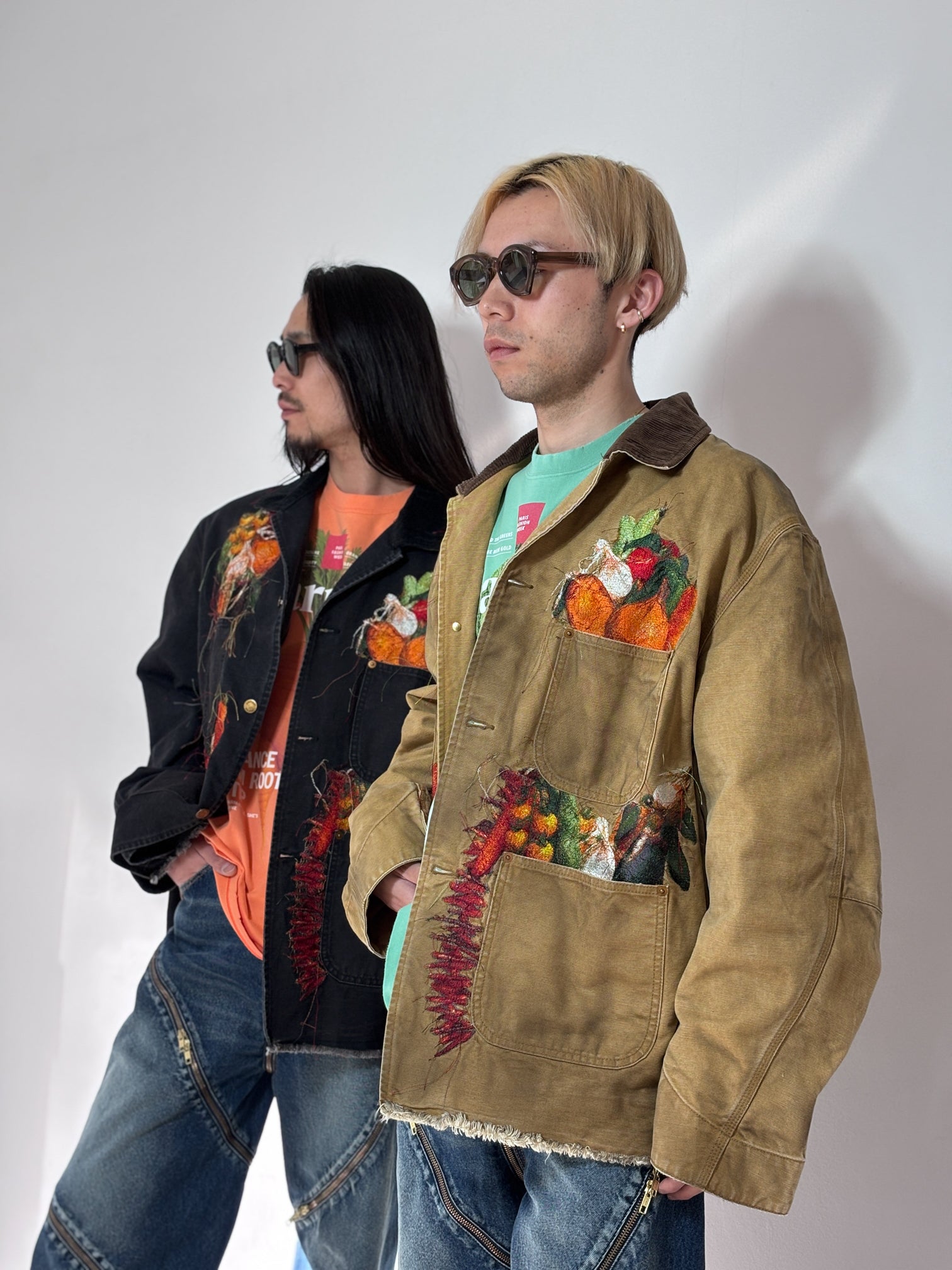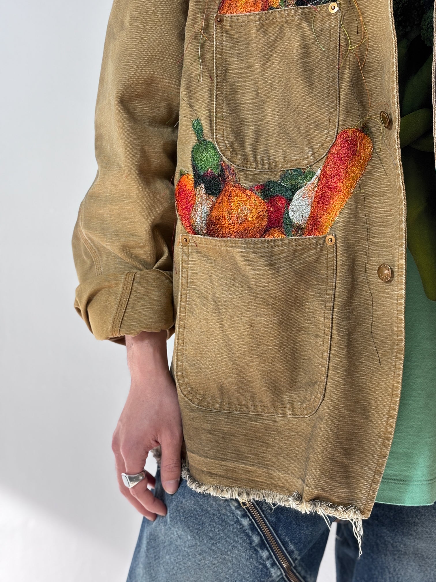 A WORK JACKET MADE FROM GARMENT-DYED AND WASHED DUCK FABRIC, FEATURING REALISTIC EMBROIDERY OF ONIONS, CARROTS, BELL PEPPERS, GARLIC, RED CHILI PEPPERS, AND EGGPLANTS. THE RUGGED SILHOUETTE RESEMBLES VINTAGE UTILITY WEAR, CONTRASTED BY THE COLORFUL VEGETABLES OVERFLOWING FROM THE POCKETS.