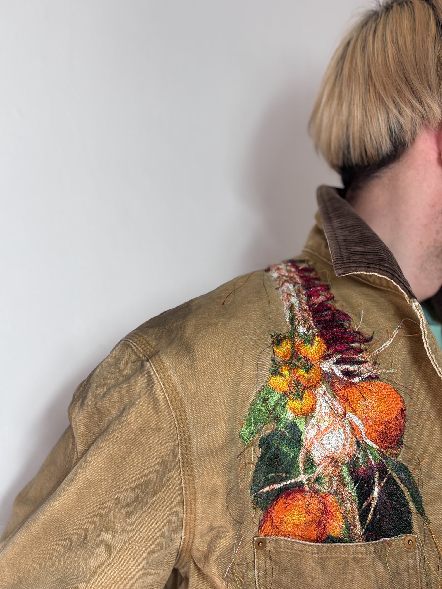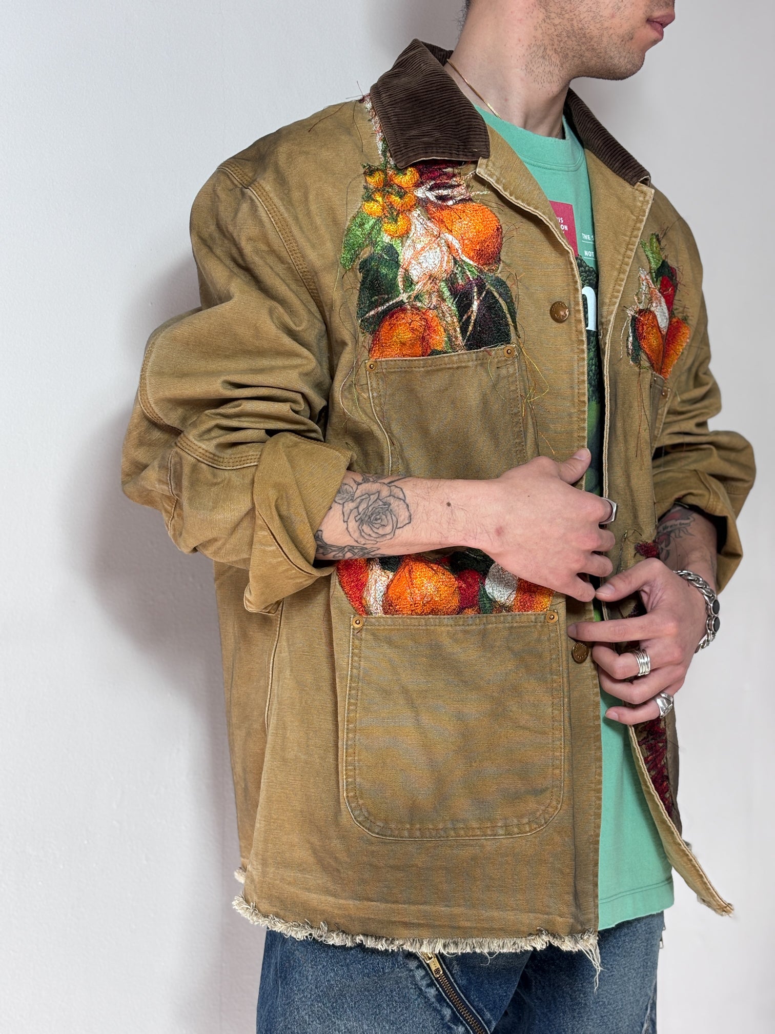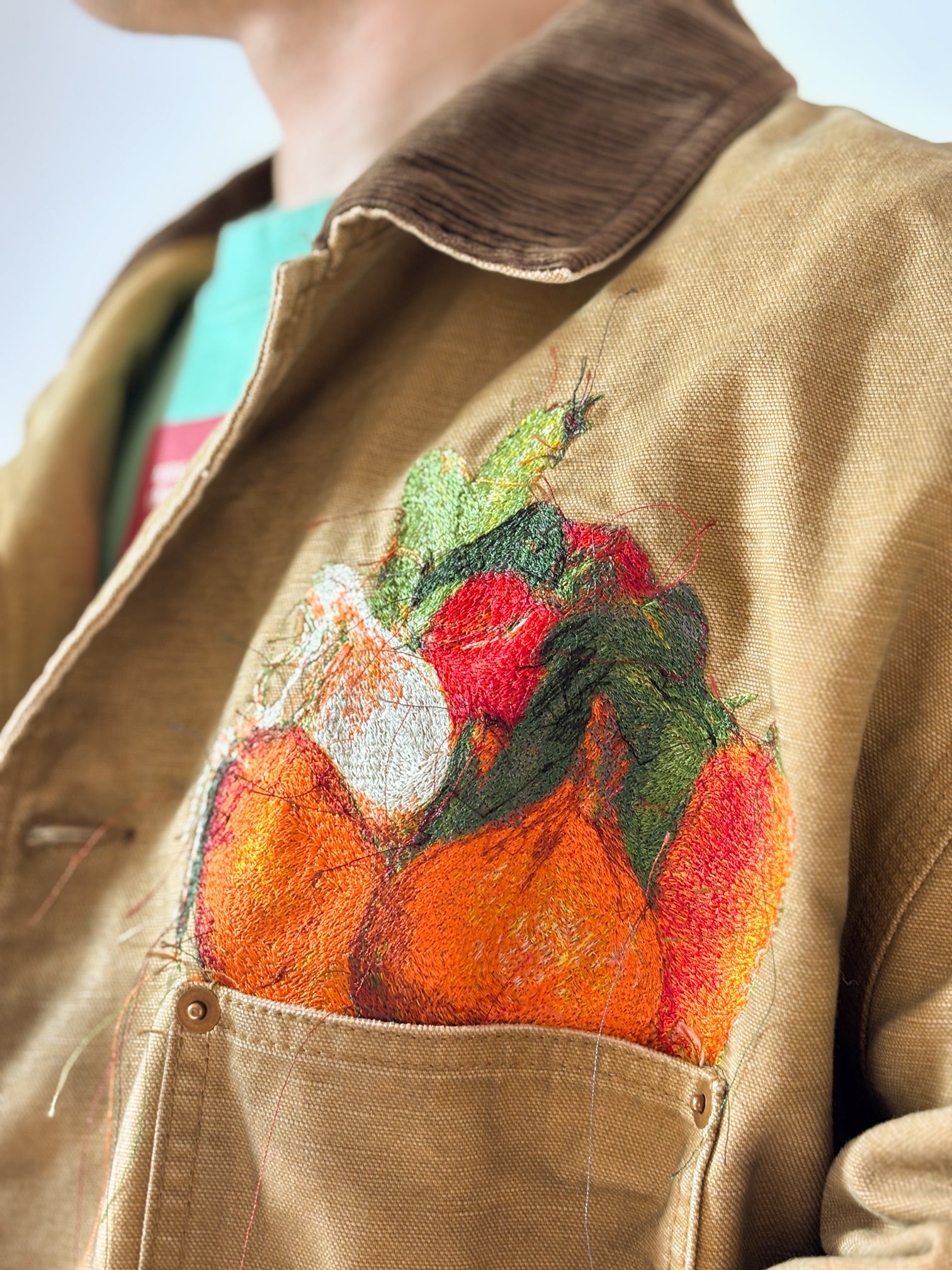 A WORK JACKET MADE FROM GARMENT-DYED AND WASHED DUCK FABRIC, FEATURING REALISTIC EMBROIDERY OF ONIONS, CARROTS, BELL PEPPERS, GARLIC, RED CHILI PEPPERS, AND EGGPLANTS. THE RUGGED SILHOUETTE RESEMBLES VINTAGE UTILITY WEAR, CONTRASTED BY THE COLORFUL VEGETABLES OVERFLOWING FROM THE POCKETS.