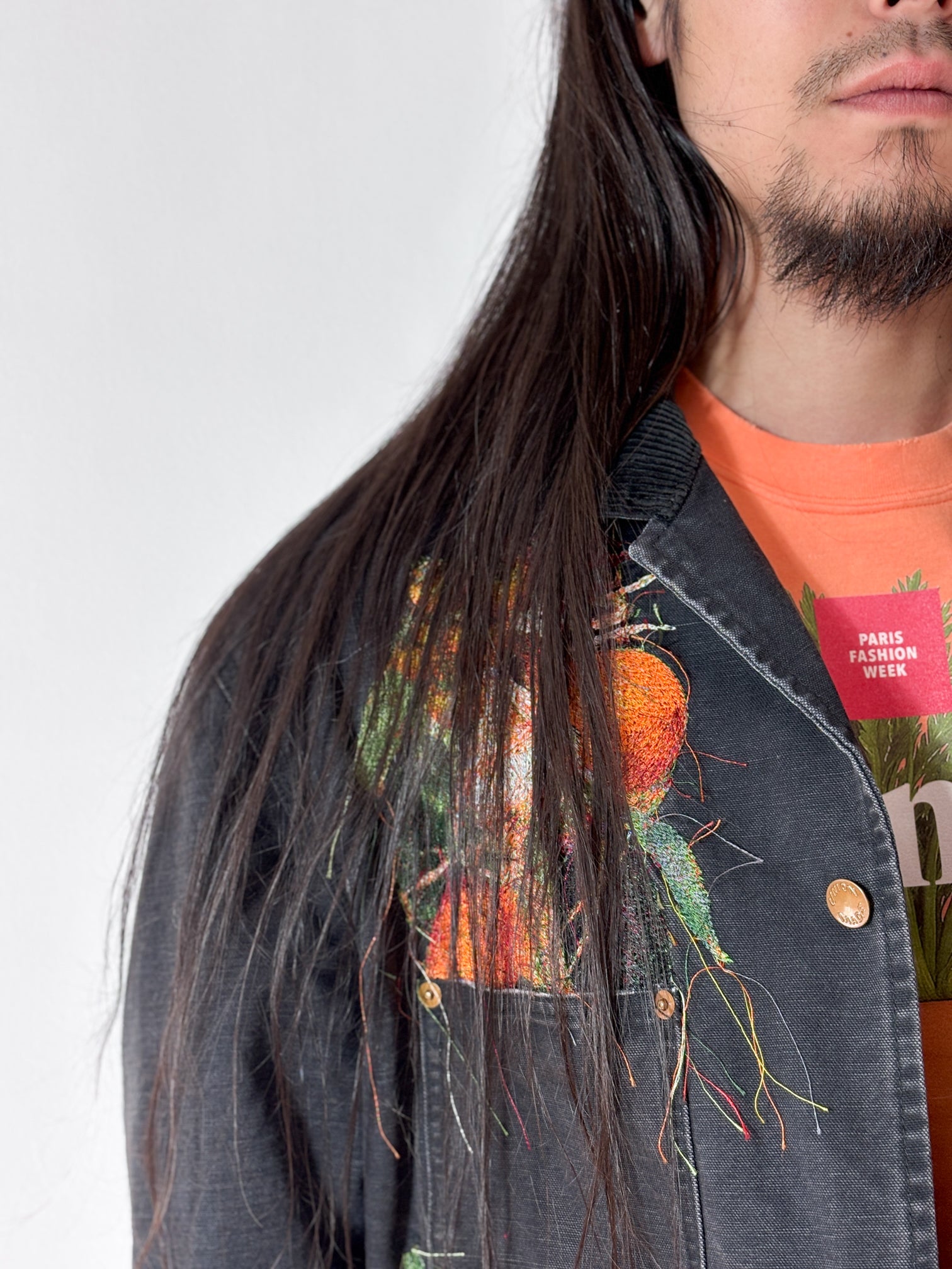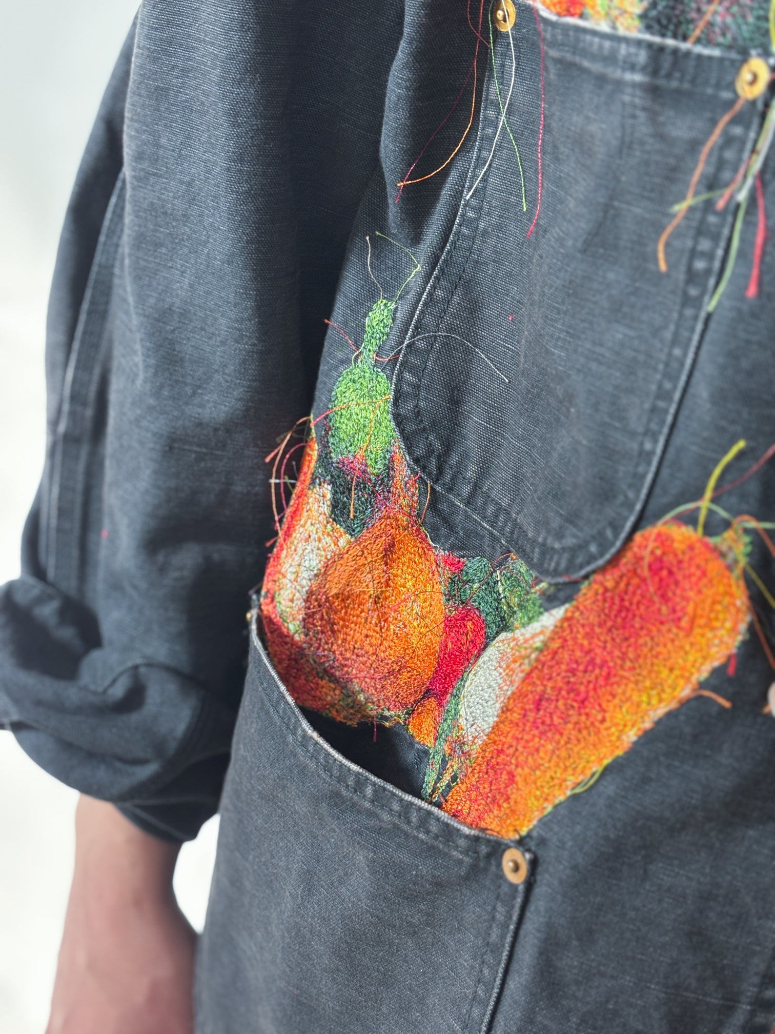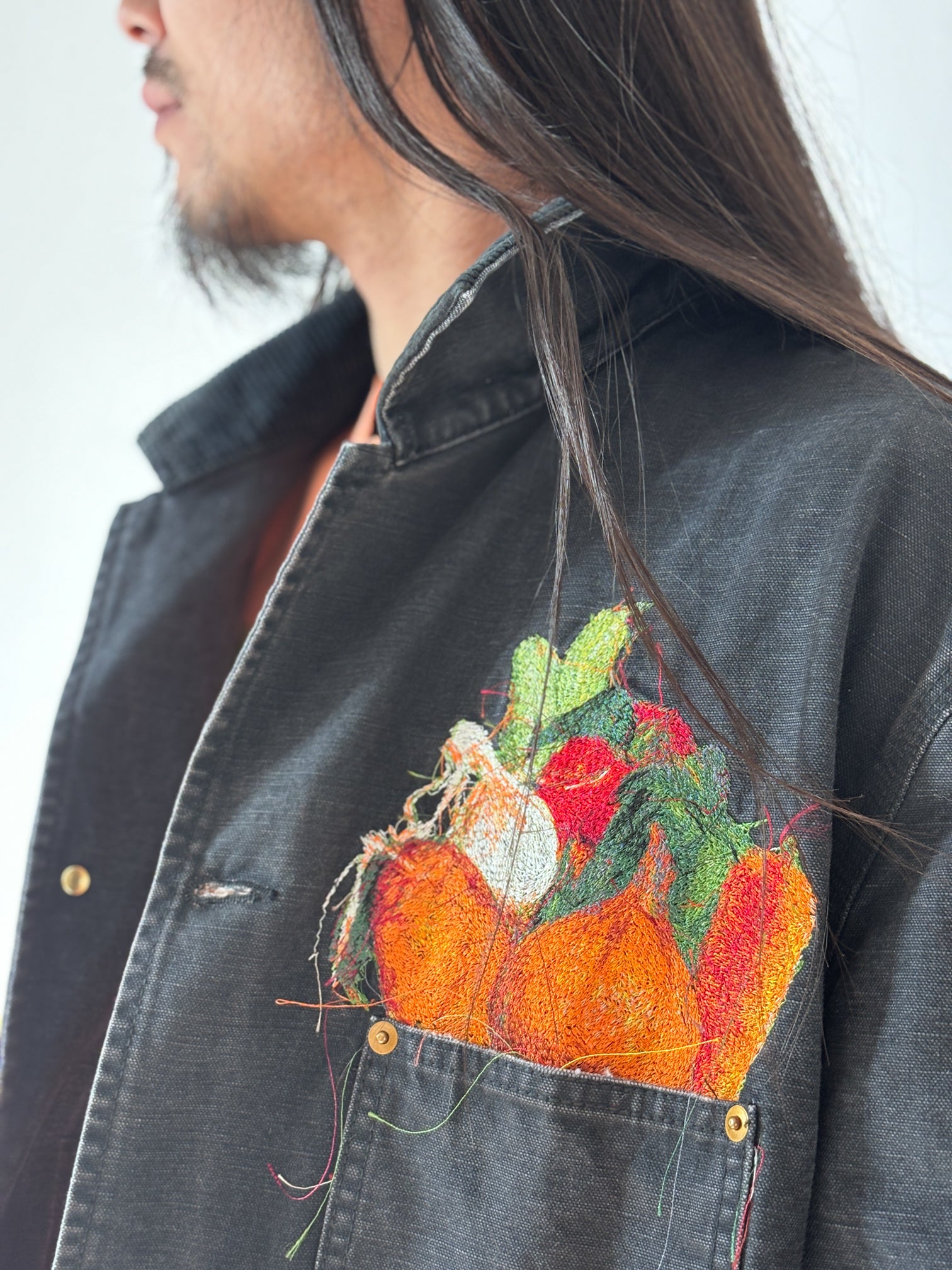 A WORK JACKET MADE FROM GARMENT-DYED AND WASHED DUCK FABRIC, FEATURING REALISTIC EMBROIDERY OF ONIONS, CARROTS, BELL PEPPERS, GARLIC, RED CHILI PEPPERS, AND EGGPLANTS. THE RUGGED SILHOUETTE RESEMBLES VINTAGE UTILITY WEAR, CONTRASTED BY THE COLORFUL VEGETABLES OVERFLOWING FROM THE POCKETS.