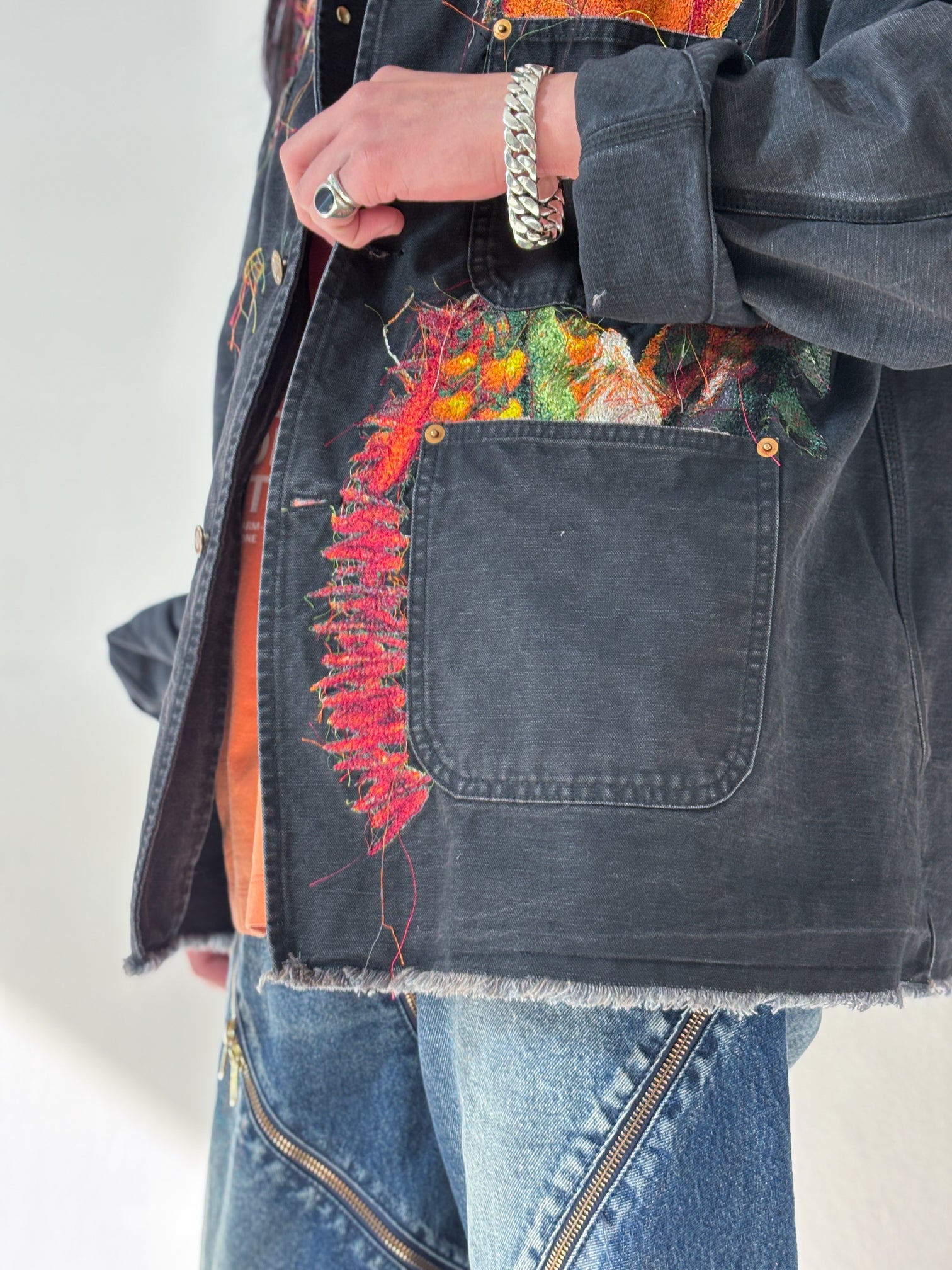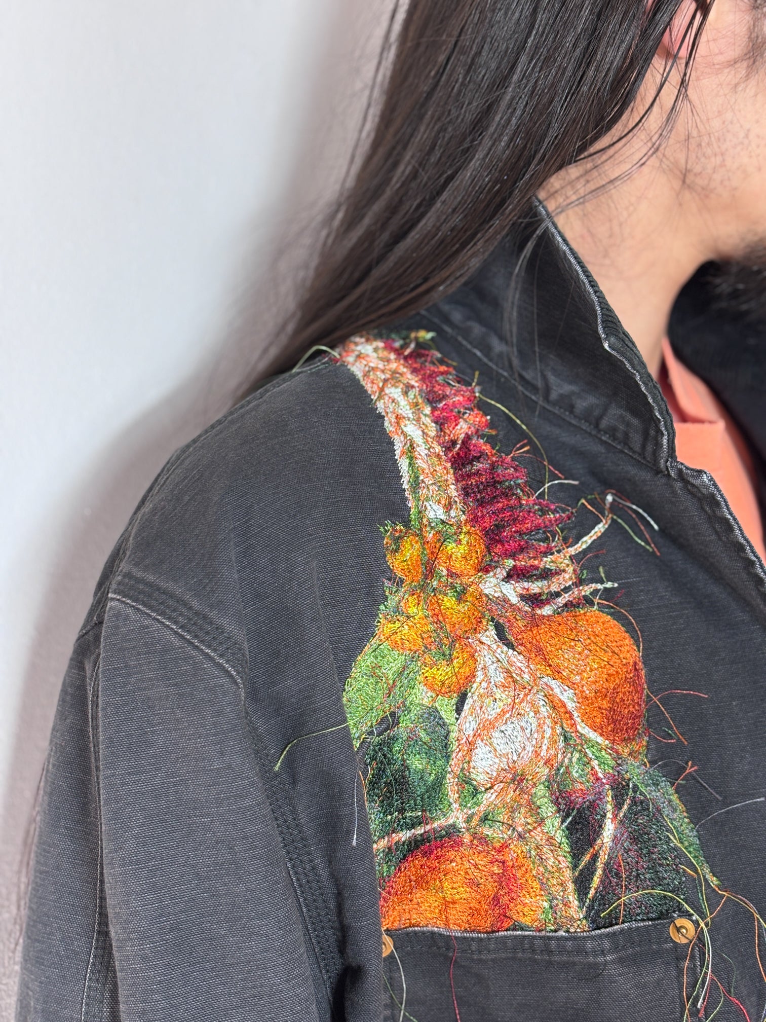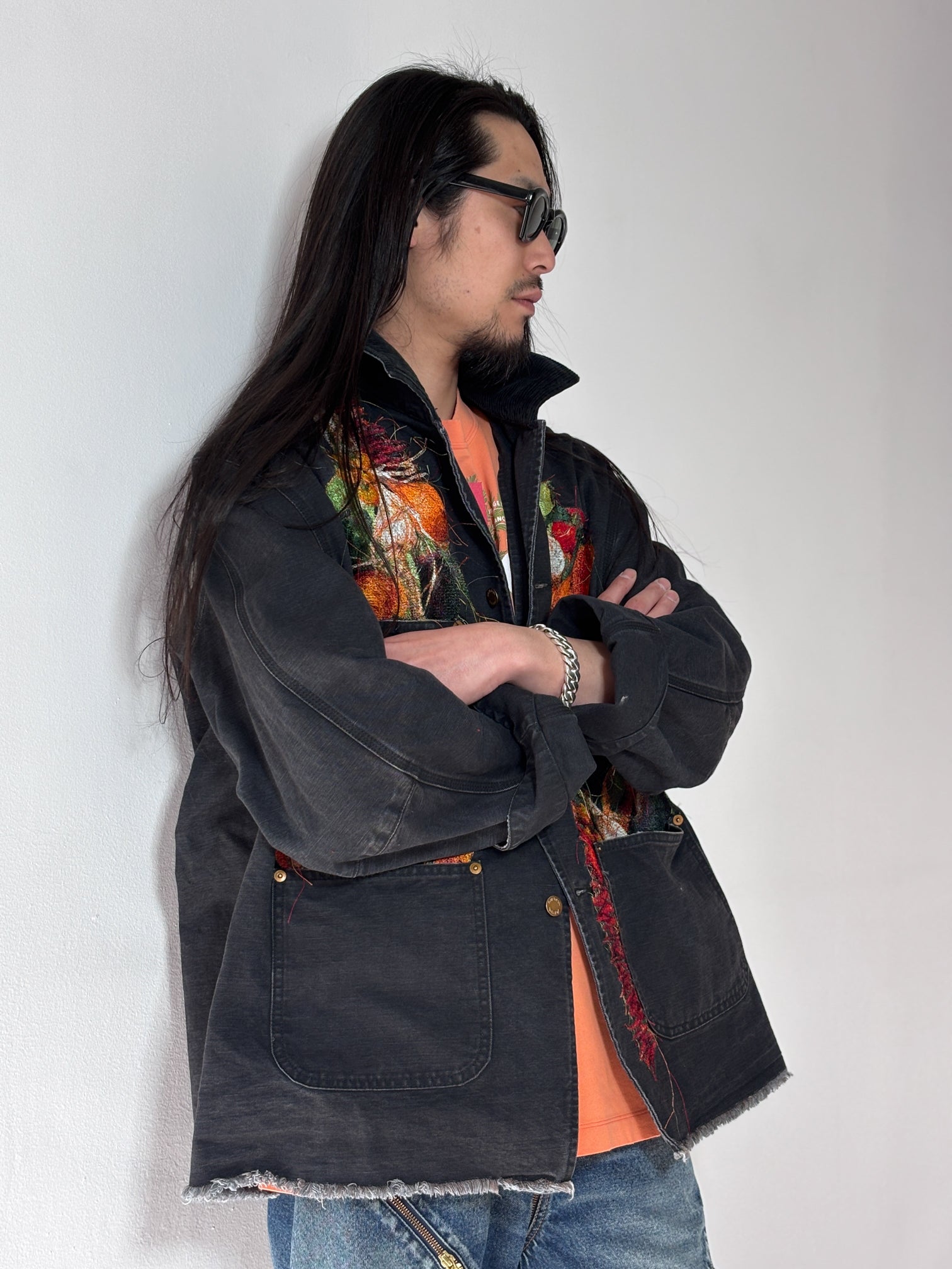 A WORK JACKET MADE FROM GARMENT-DYED AND WASHED DUCK FABRIC, FEATURING REALISTIC EMBROIDERY OF ONIONS, CARROTS, BELL PEPPERS, GARLIC, RED CHILI PEPPERS, AND EGGPLANTS. THE RUGGED SILHOUETTE RESEMBLES VINTAGE UTILITY WEAR, CONTRASTED BY THE COLORFUL VEGETABLES OVERFLOWING FROM THE POCKETS.