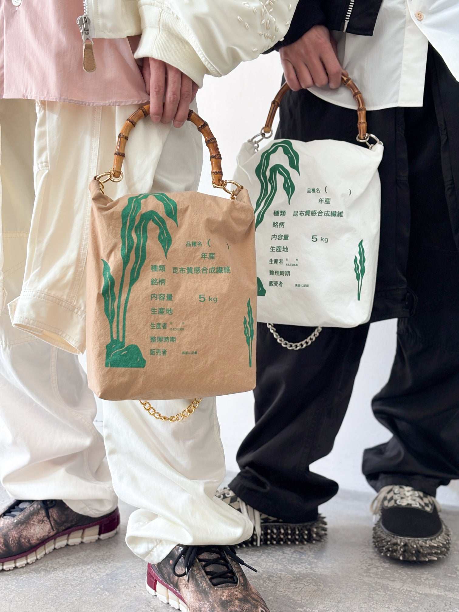 A BAG DESIGNED TO RESEMBLE A RICE SACK, TRANSLATED DIRECTLY INTO A WEARABLE FORM. THE PRACTICAL, UNADORNED SHAPE IS PAIRED WITH A BAMBOO HANDLE THAT EVOKES ICONIC LUXURY BAGS, CREATING A BALANCE BETWEEN MODESTY AND ELEGANCE. LIGHTWEIGHT AND EASY TO CARRY, IT COMBINES EVERYDAY FUNCTION WITH A DISTINCT PRESENCE.