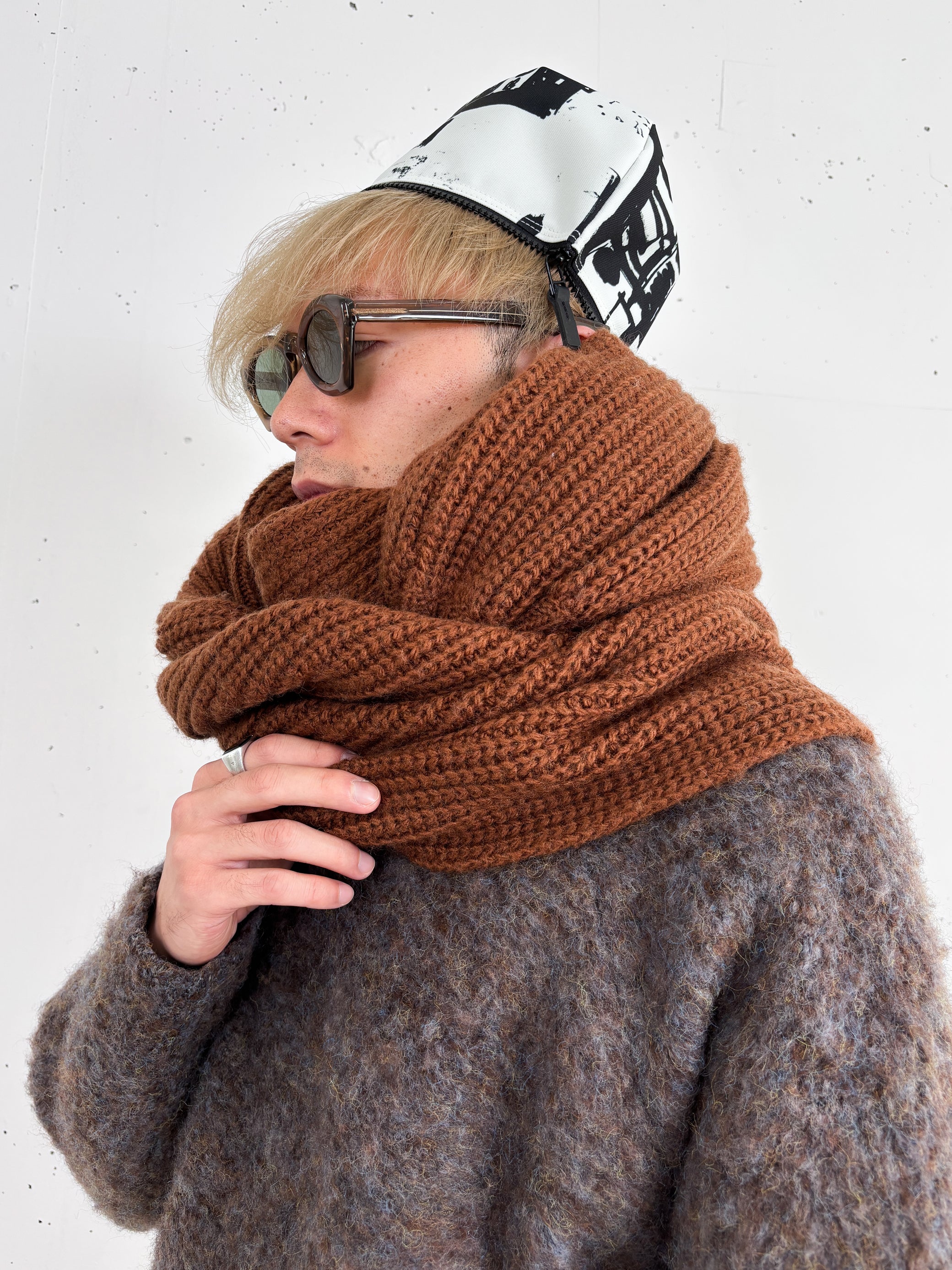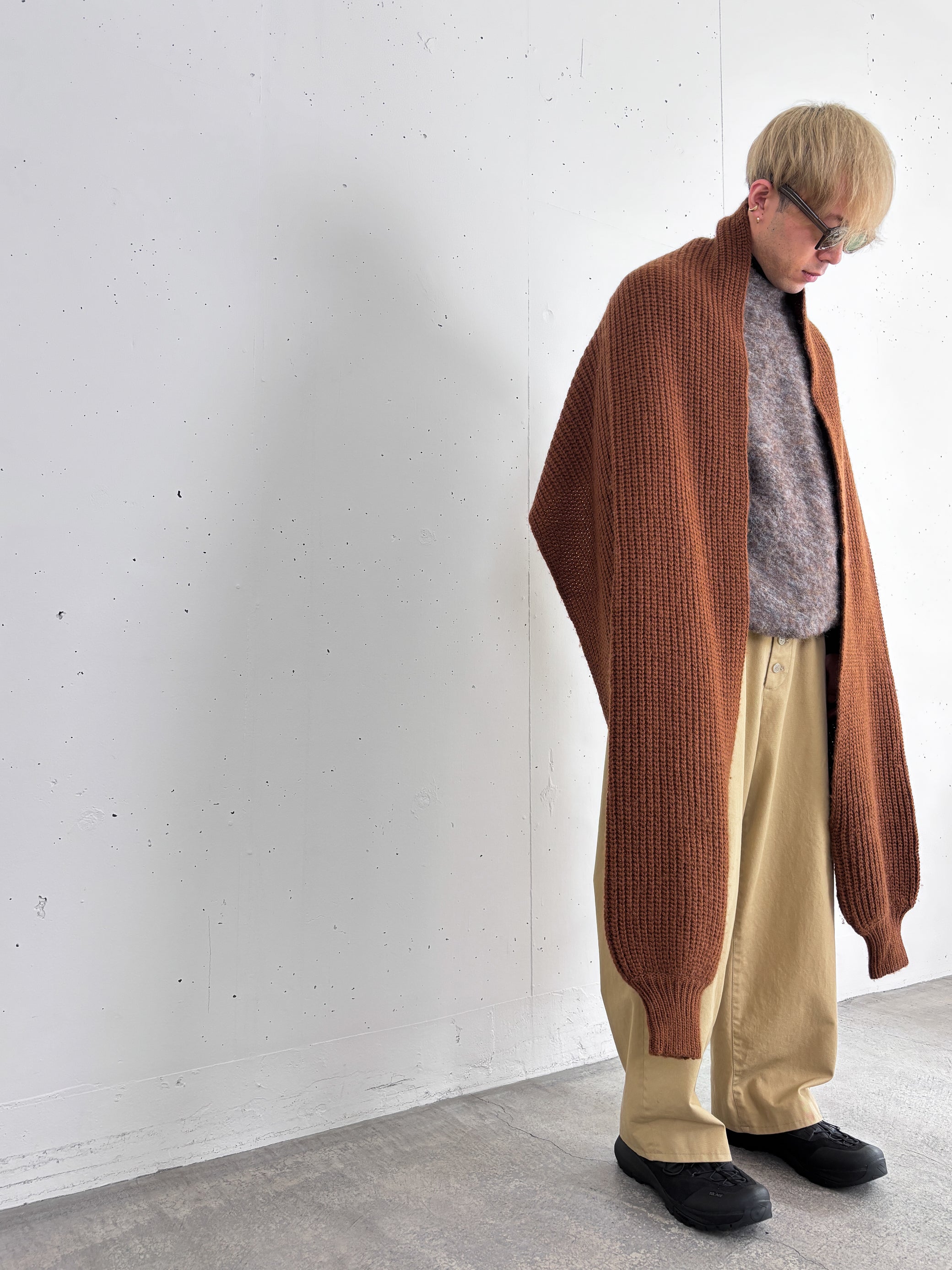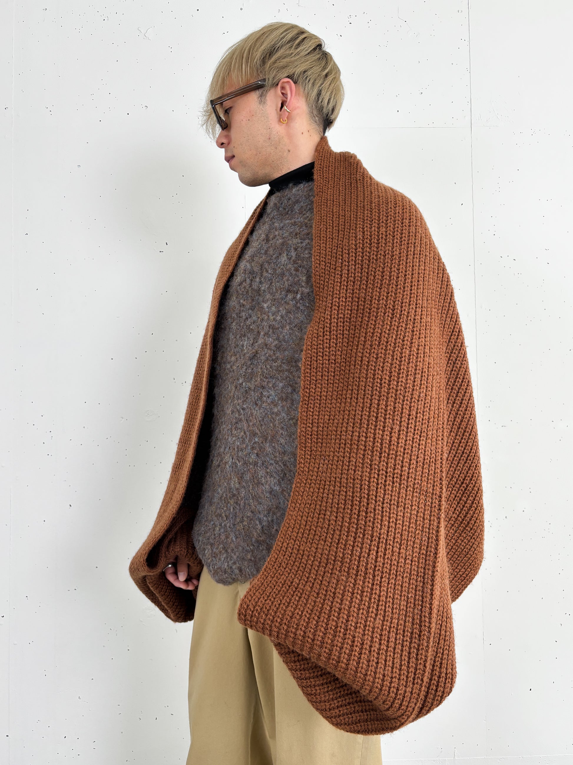 首に巻いても、肩を覆うように掛けても、リブに袖も通して着てもと様々な仕様が楽しめるデザインとなっており、大ぶりに設定されたサイズ感なのでコートやジャケット、厚手のニットやトレーナーと様々なアイテムと組み合わせていただけます。