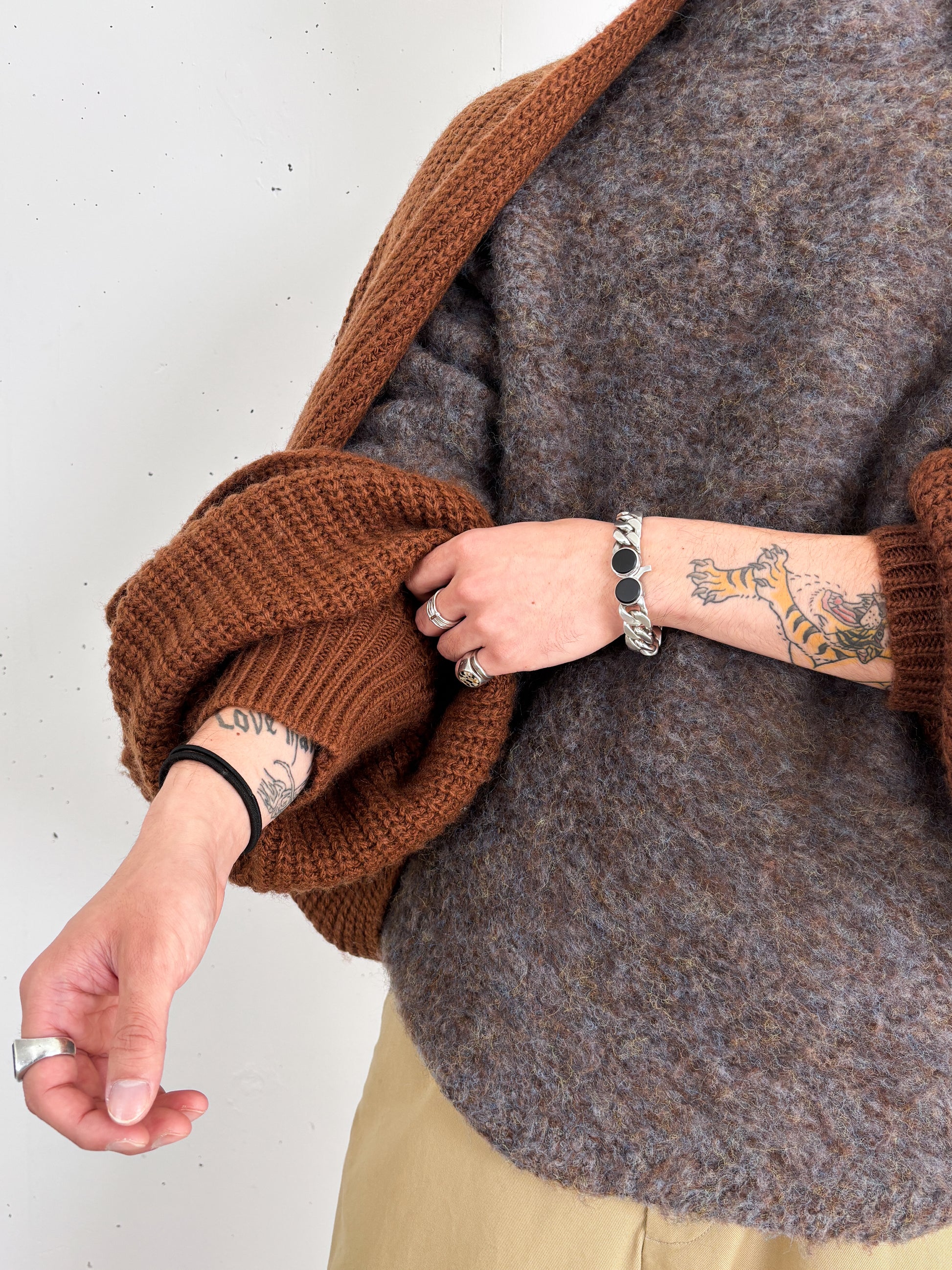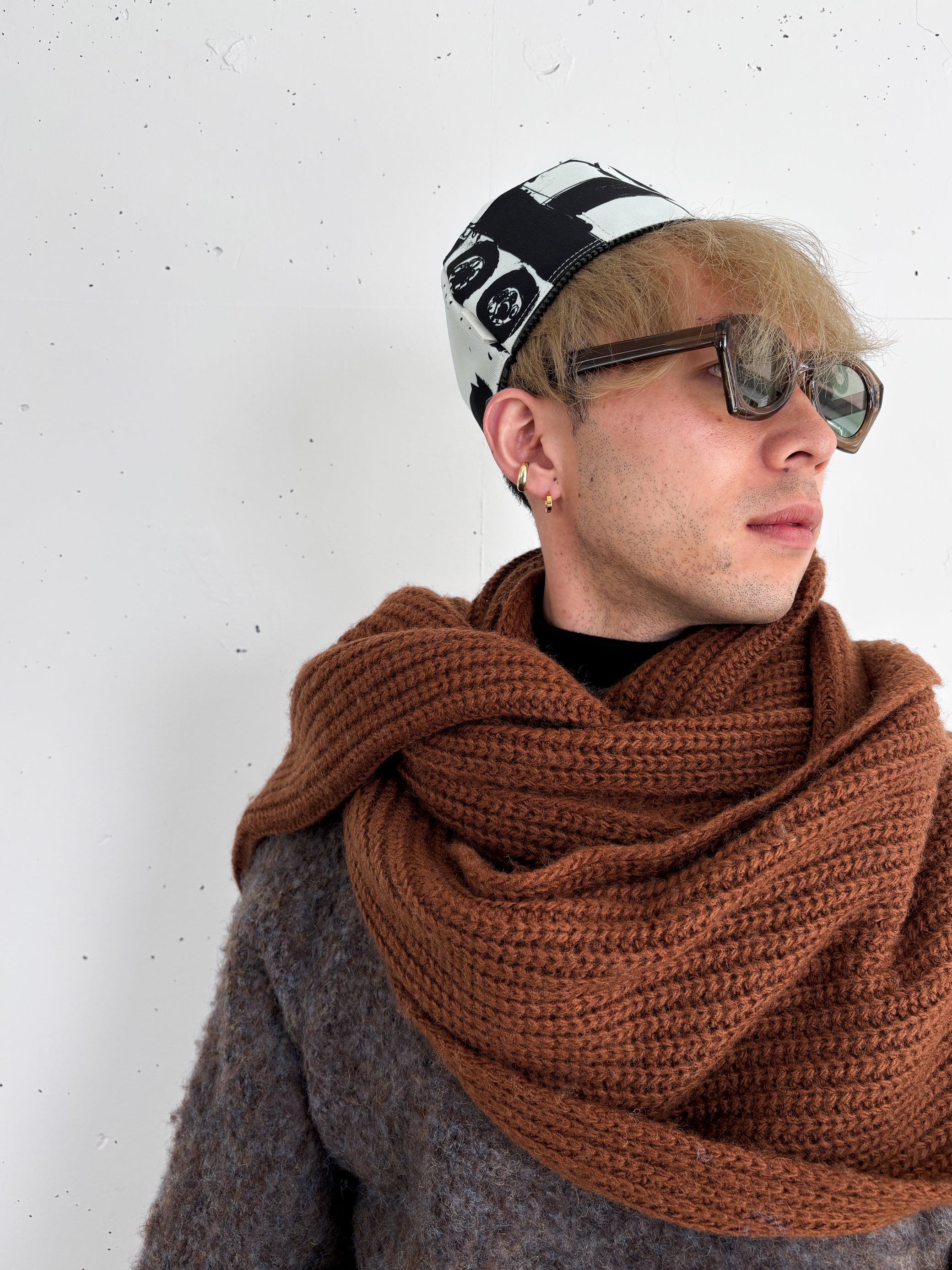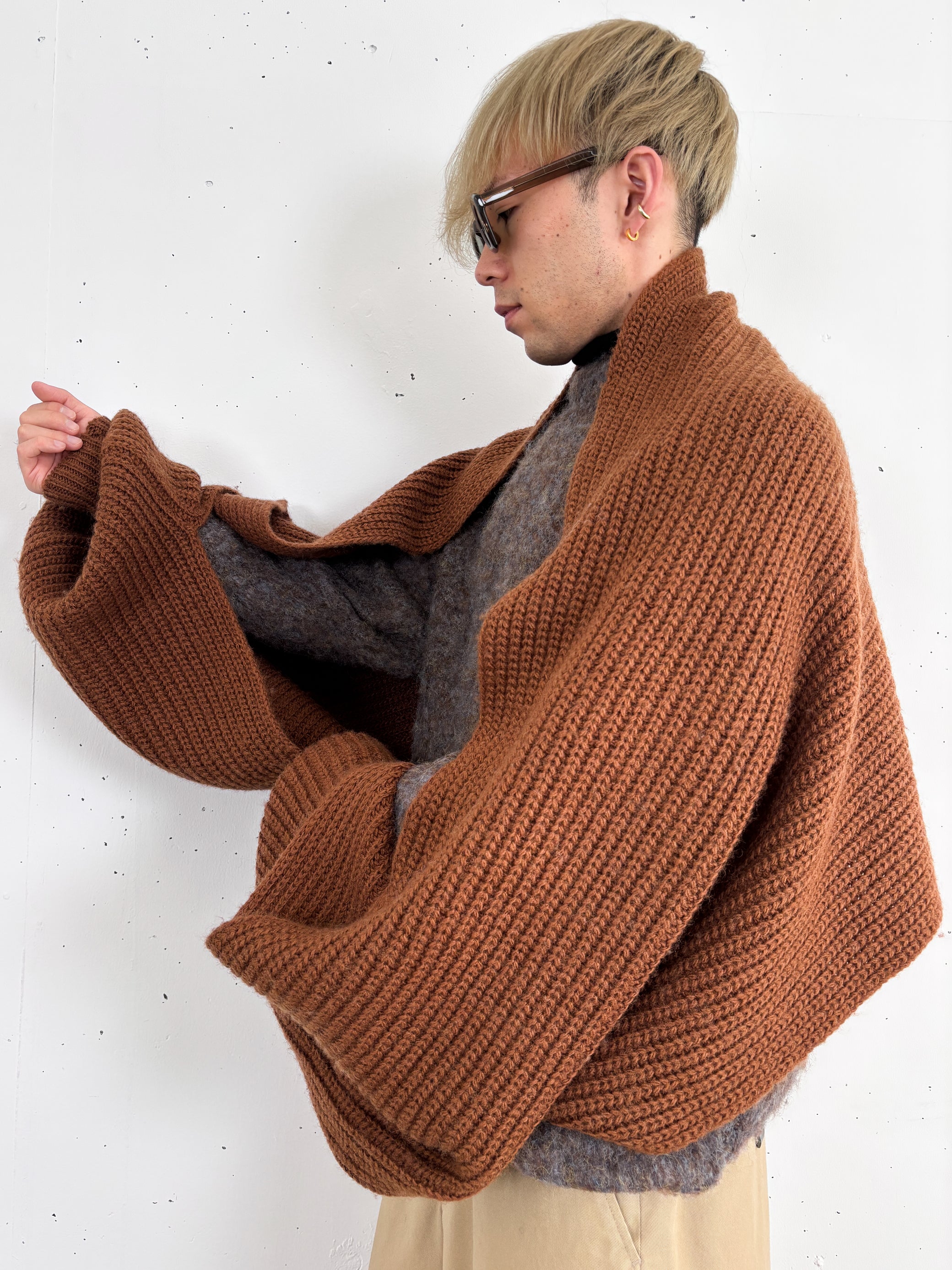 首に巻いても、肩を覆うように掛けても、リブに袖も通して着てもと様々な仕様が楽しめるデザインとなっており、大ぶりに設定されたサイズ感なのでコートやジャケット、厚手のニットやトレーナーと様々なアイテムと組み合わせていただけます。