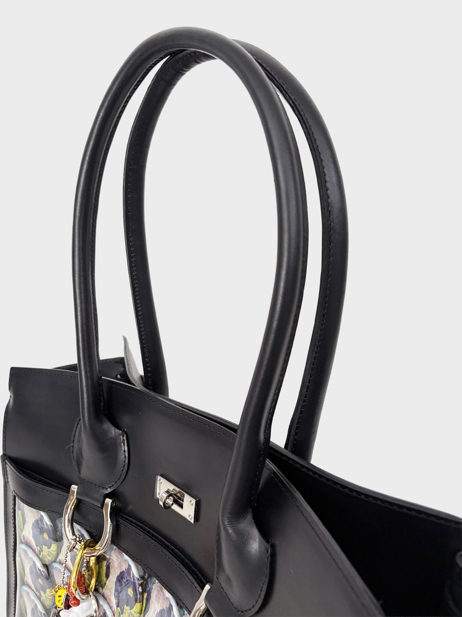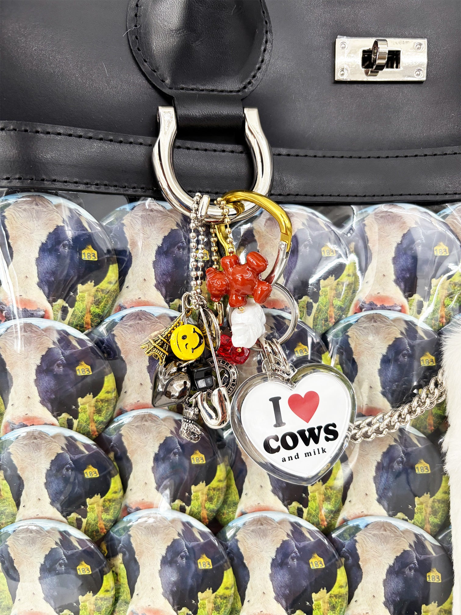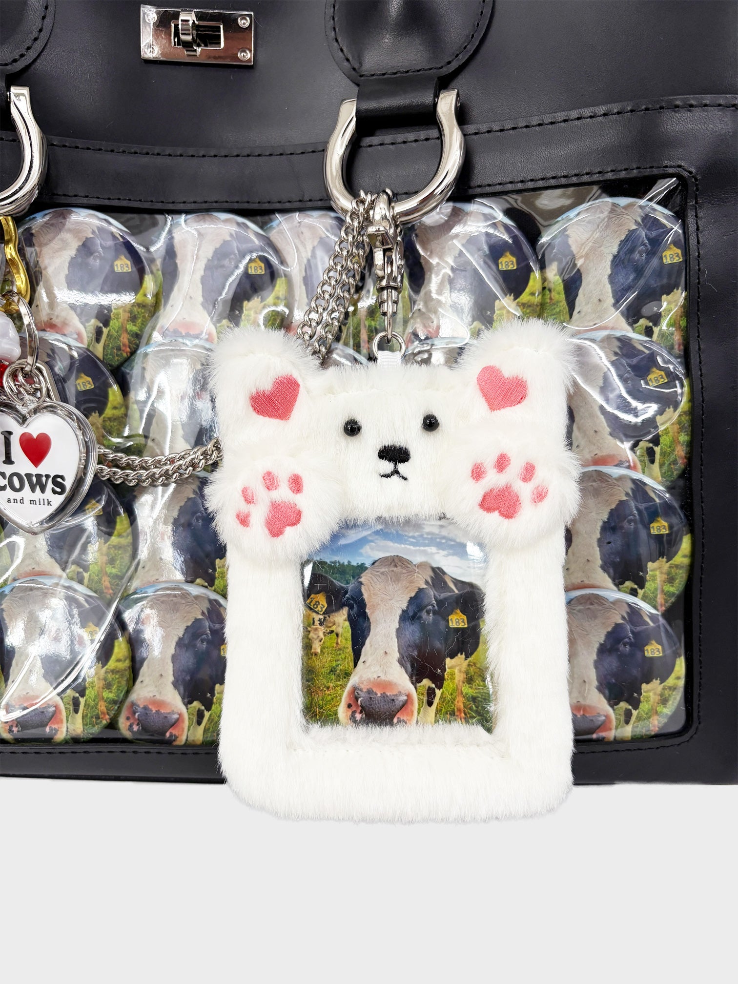 好きなアイドルやキャラクターのキーホルダーや缶バッジをたくさん飾り付けた「痛い」バッグ、通称“痛バッグ”をモチーフにしているレザーバッグです。