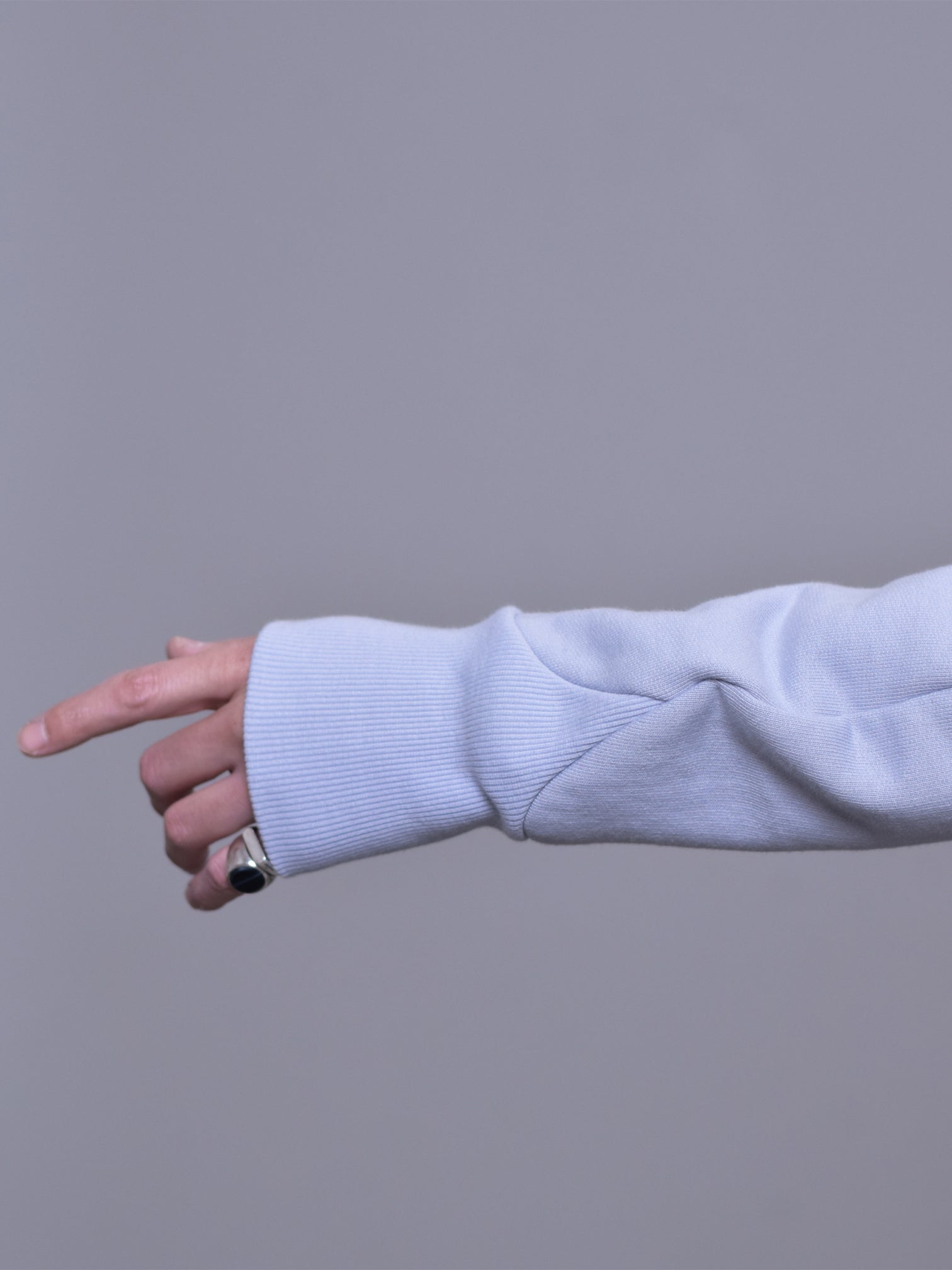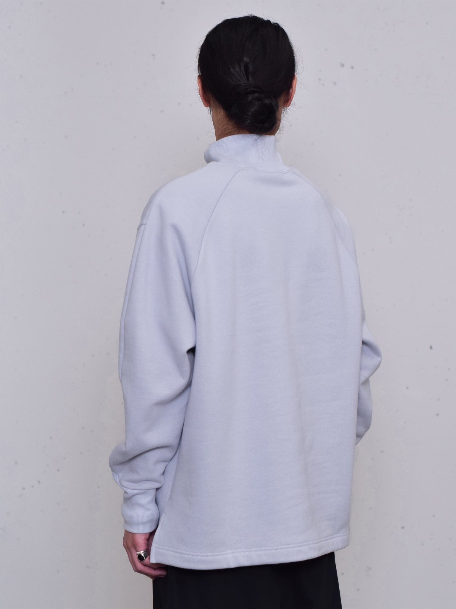 トレーナーには珍しいスプリットラグランになっているので、一枚で着ても様になるようにしています。