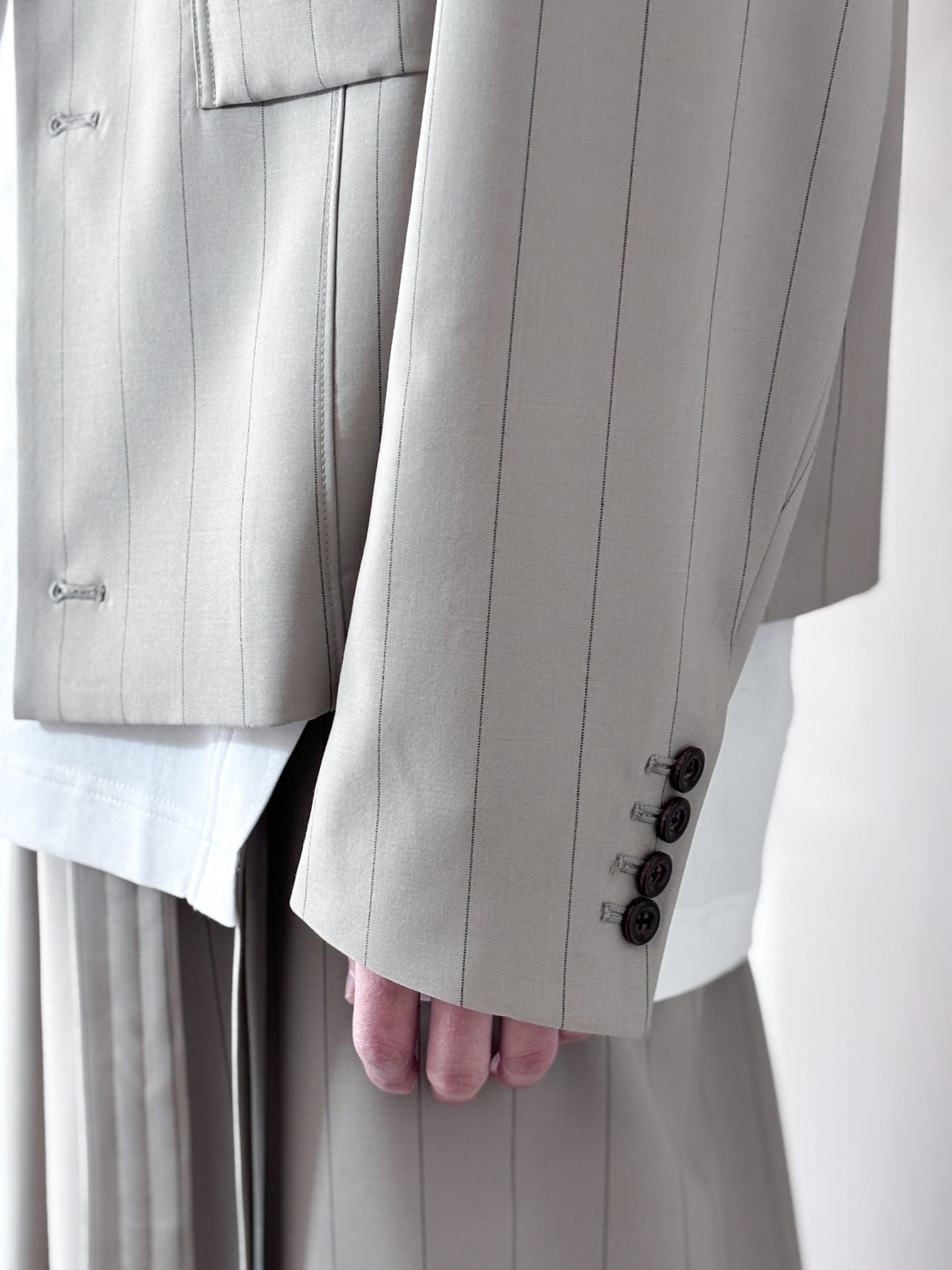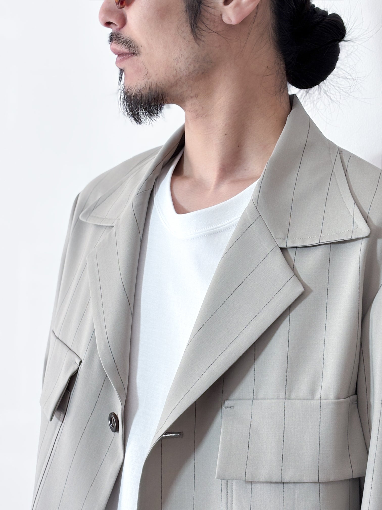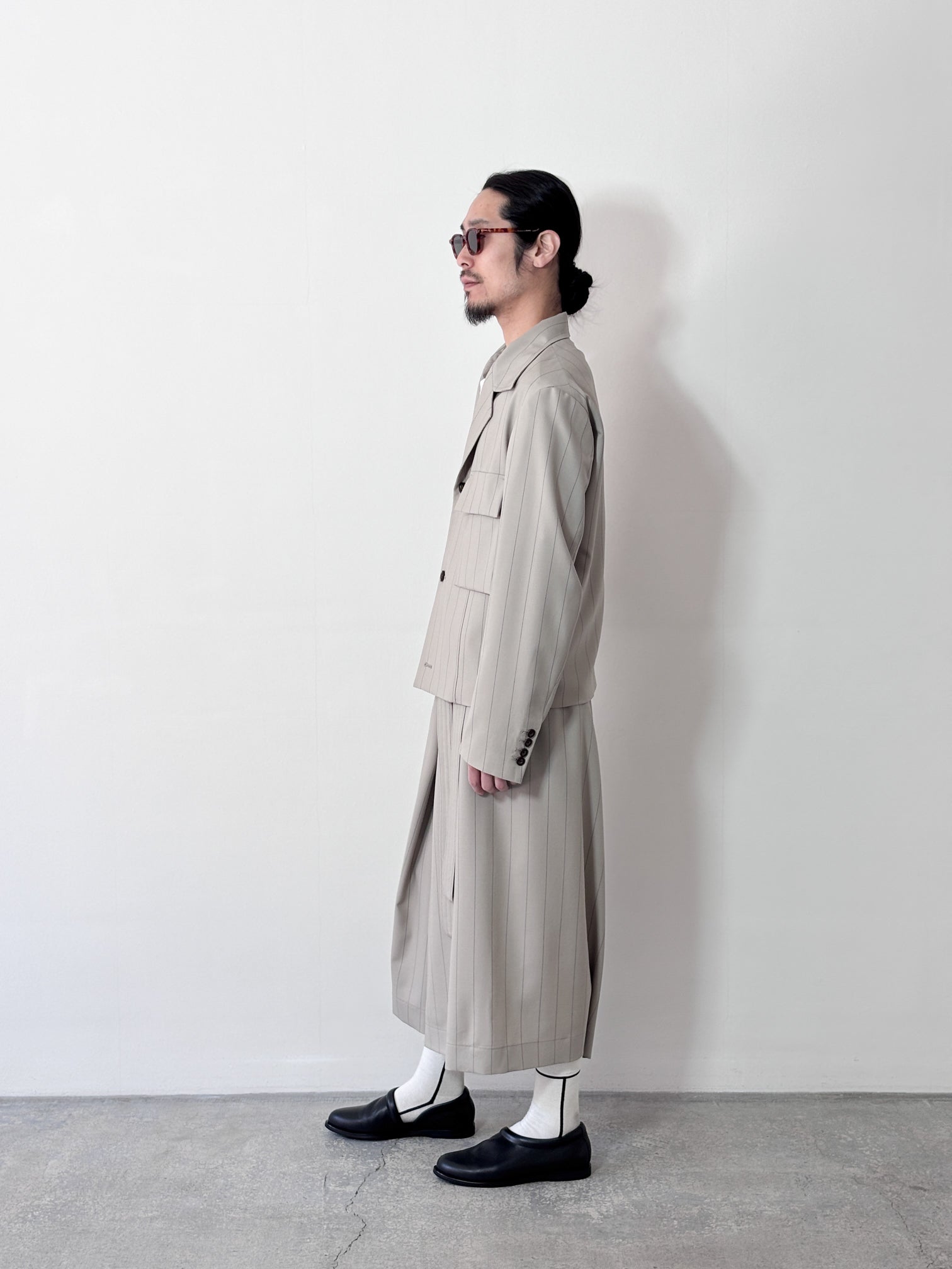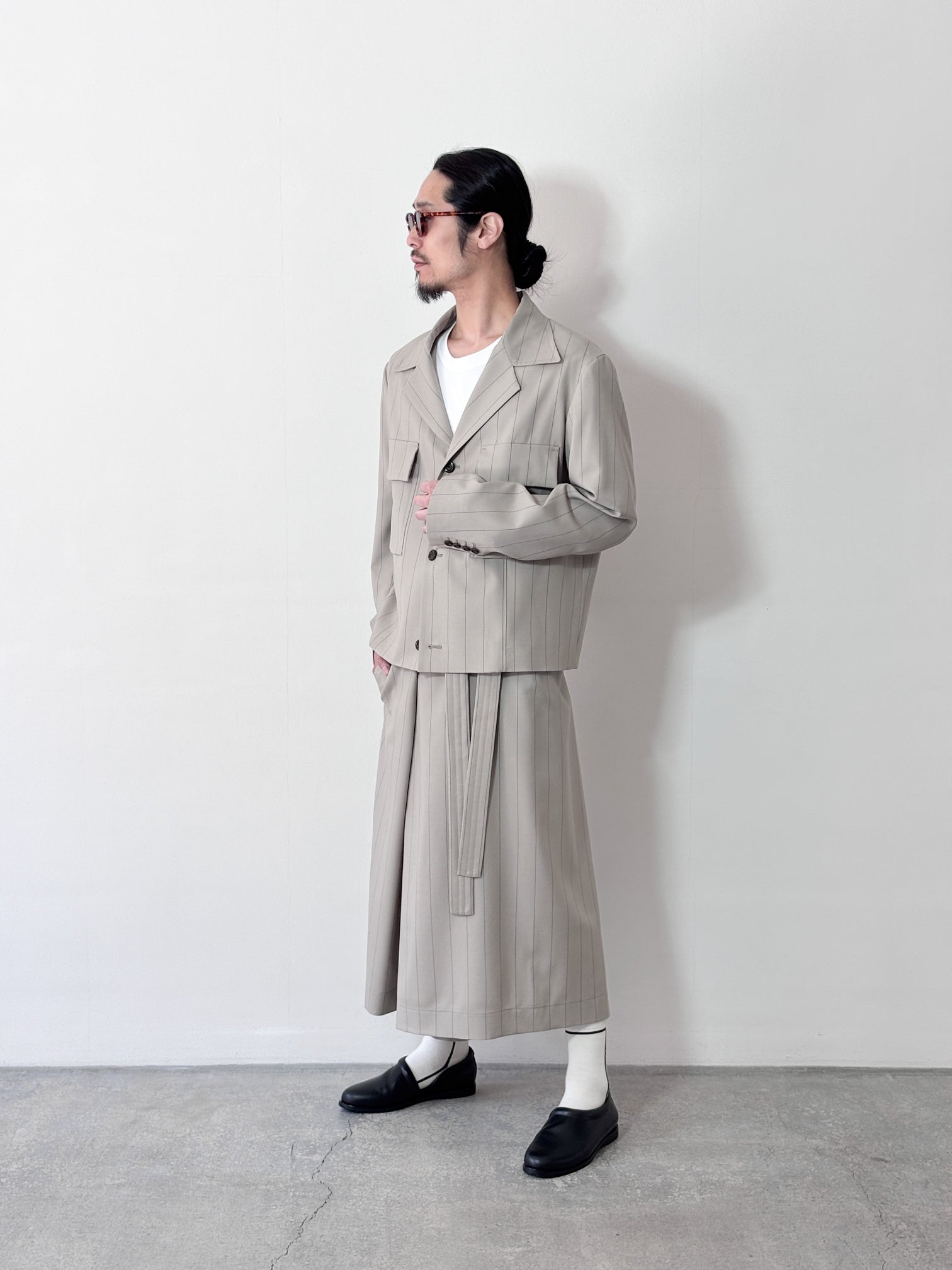 This jacket is made of pinstripe summer wool fabric with SUPER100 wool, and can be worn with a blouson-like roughness with a waist belt detail.