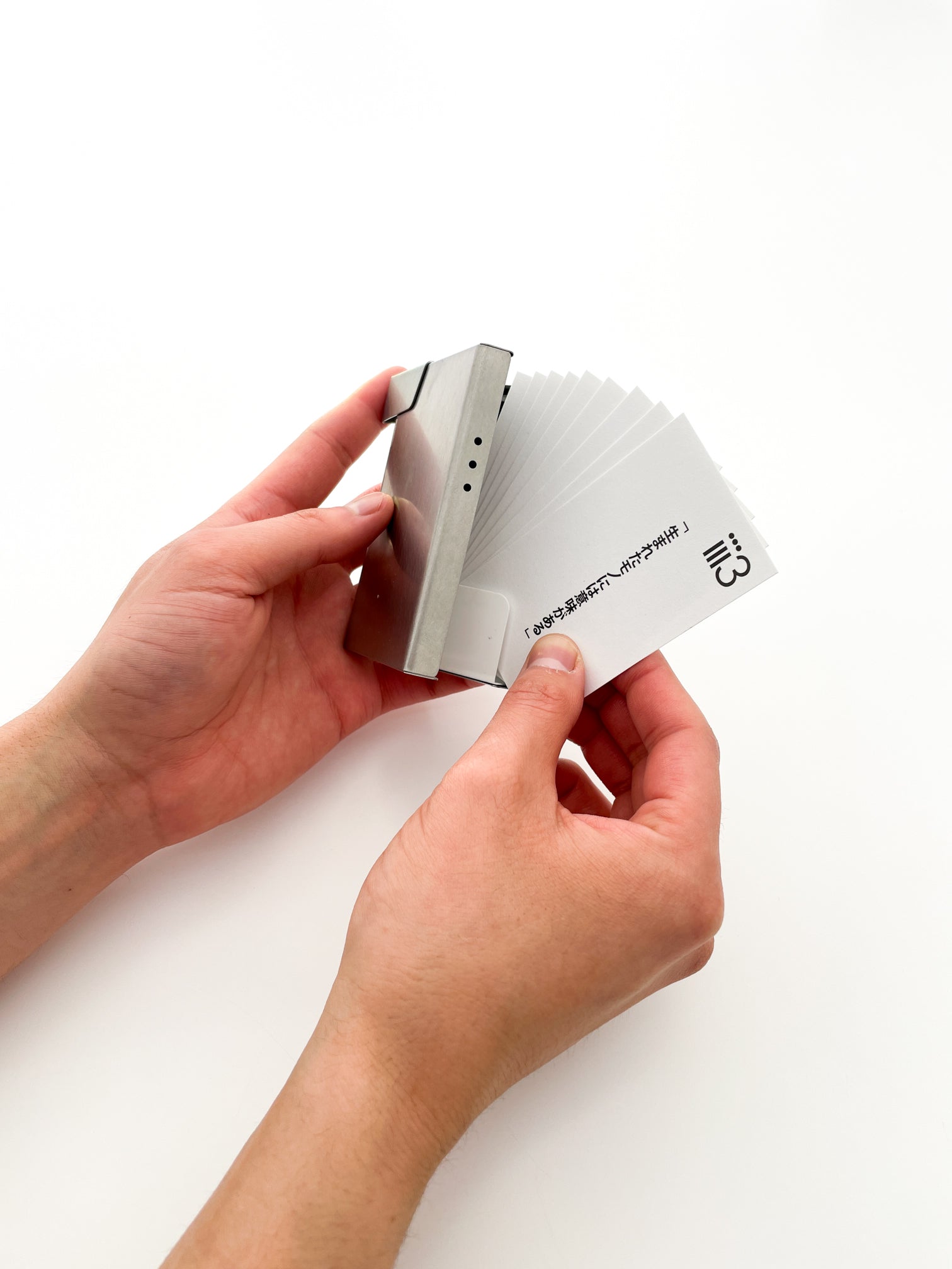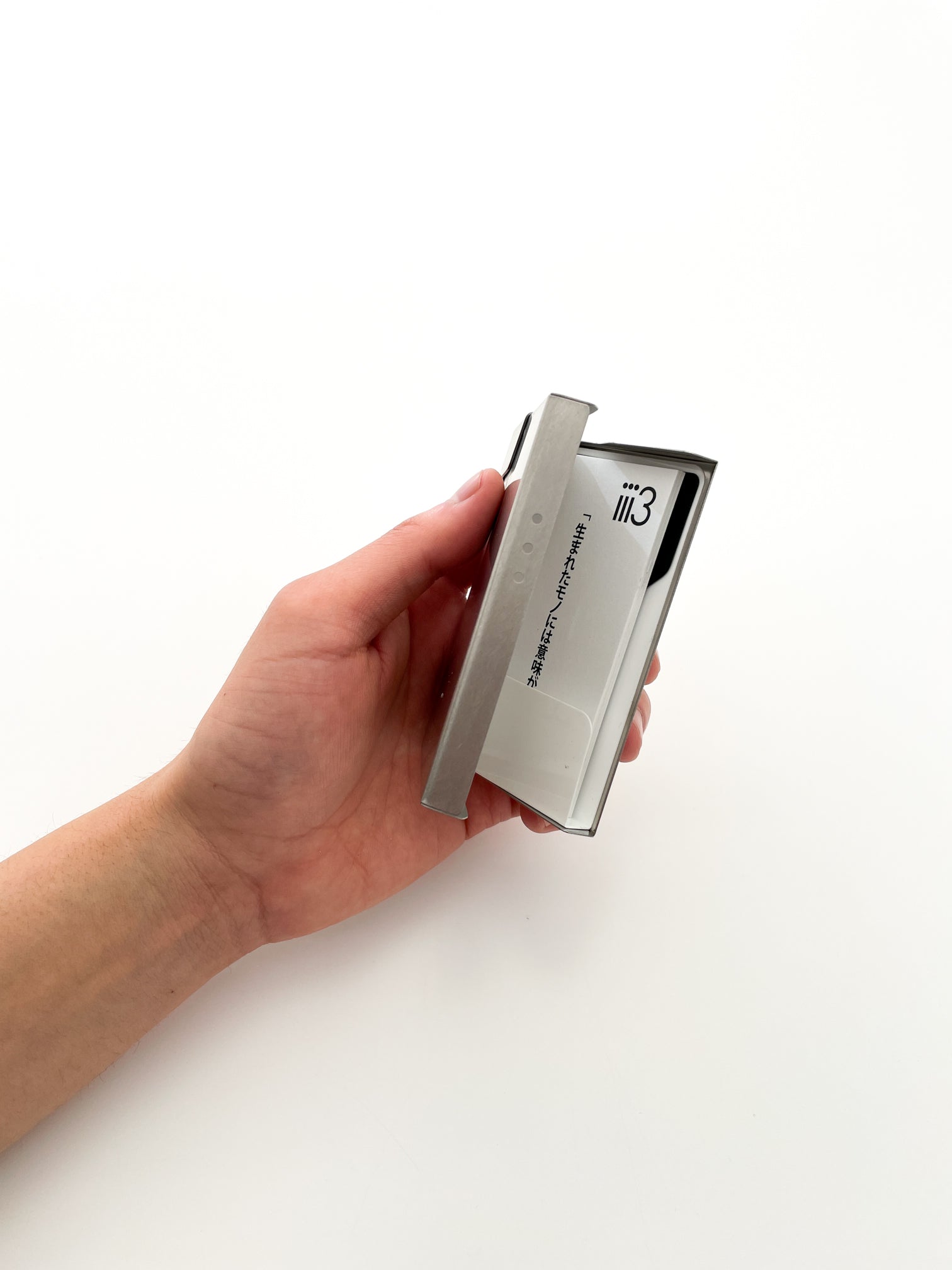 This stylish case allows you to easily insert and remove business cards and cigarettes by sliding the top part with one hand.