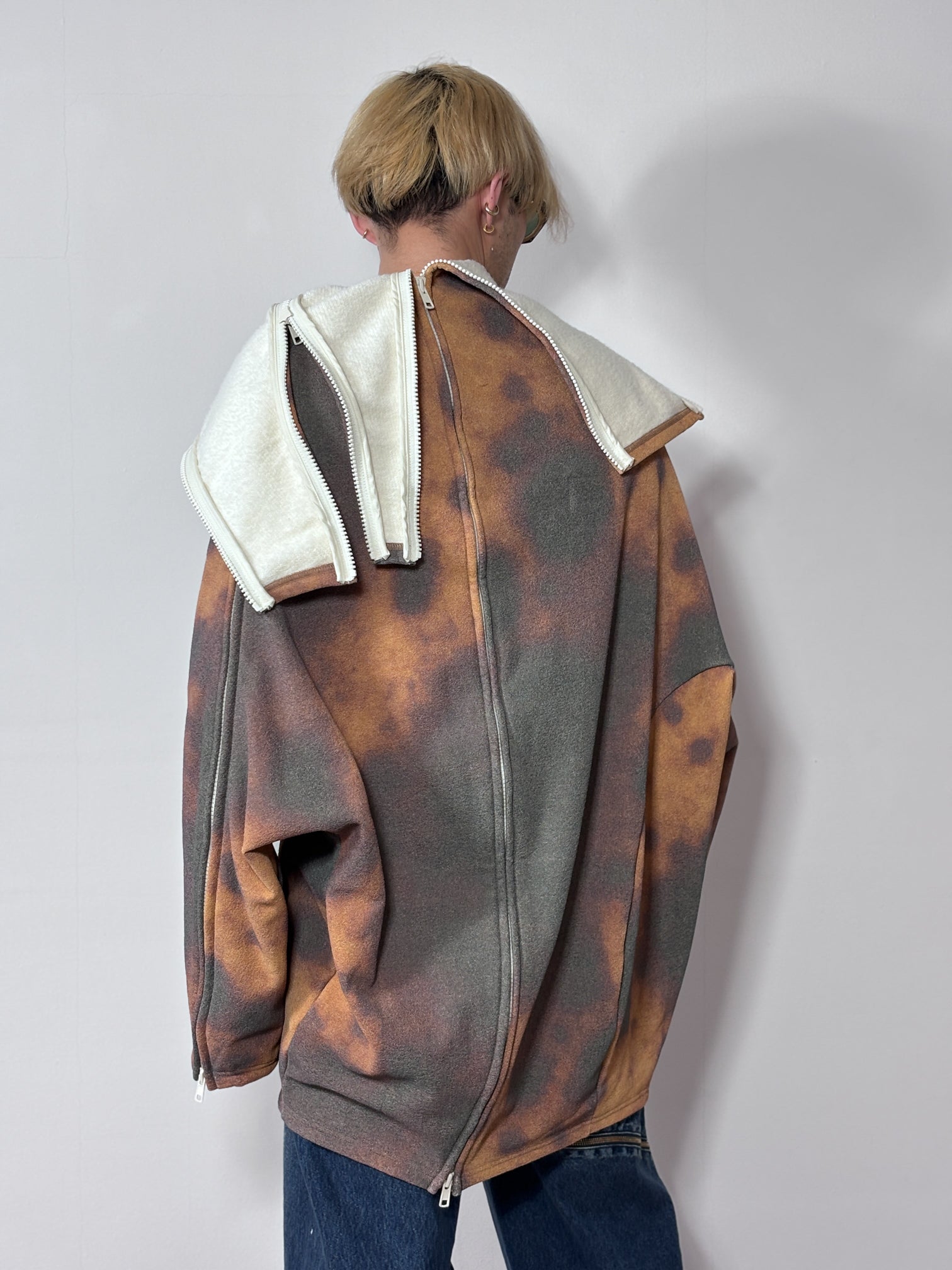THE BANANA SHAPE WAS 3D-MODELED AND THEN TRANSFORMED INTO A 2D PATTERN BY SYNFLUX’S ALGORITHM, RESULTING IN A UNIQUE CONSTRUCTION WITH NO ARMHOLES. THE ZIP OPENING MIMICS THE MOTION OF PEELING A BANANA. THE FABRIC IS A FLEECE KNIT MADE FROM UPCYCLED BANANA STALK FIBERS.