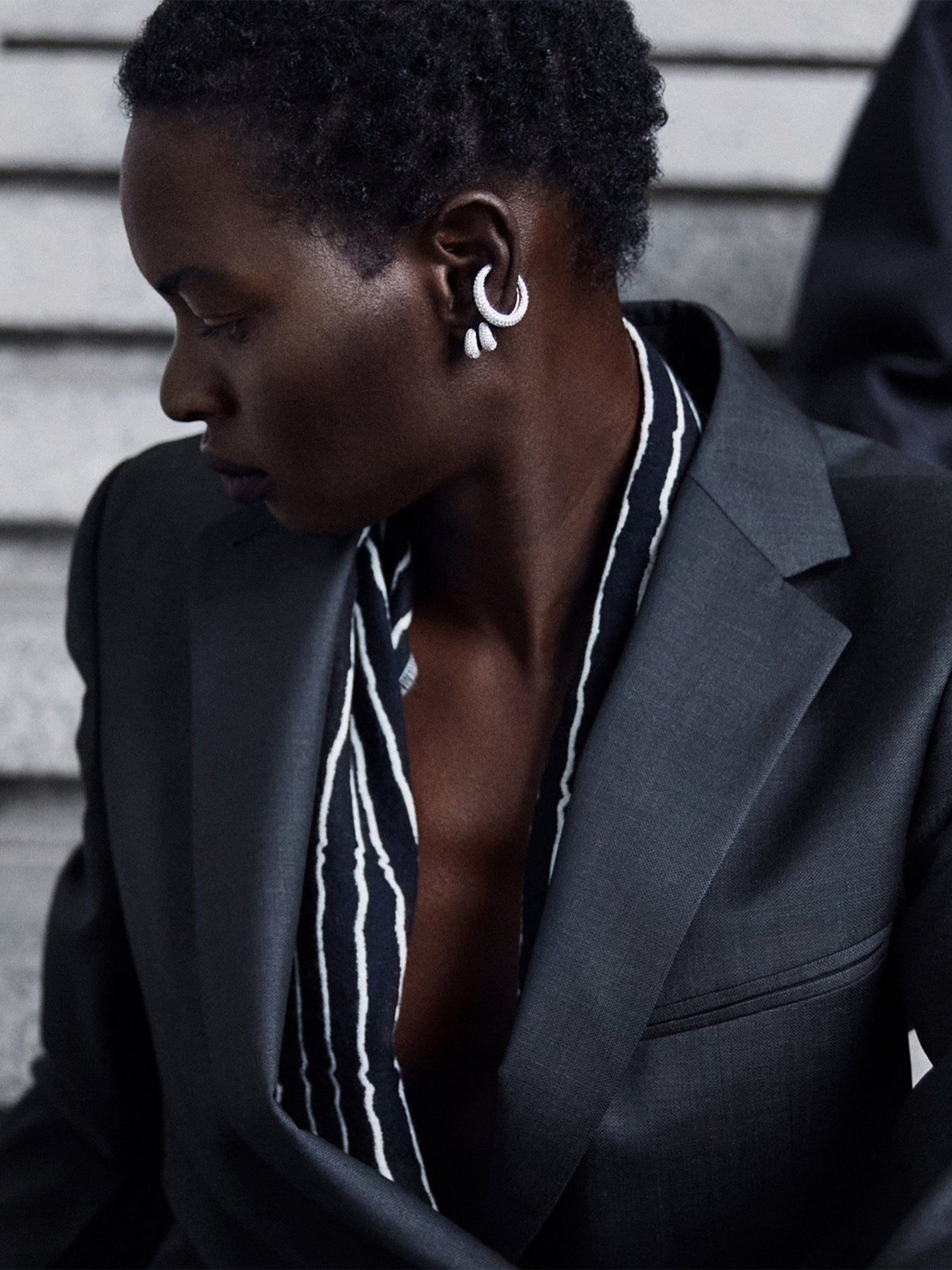This ear cuff has a white rhodium-plated sterling silver body decorated with 213 white zirconia stones for a voluminous look.