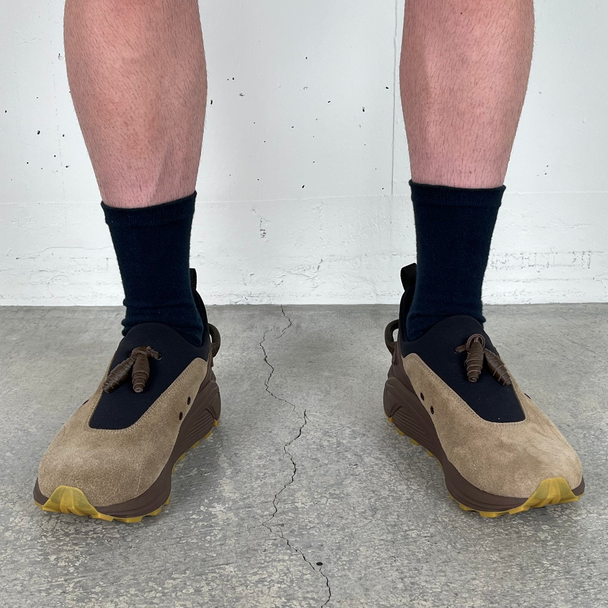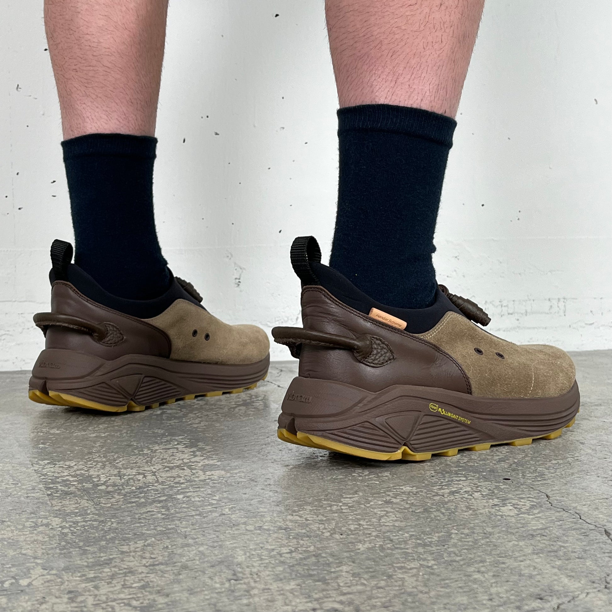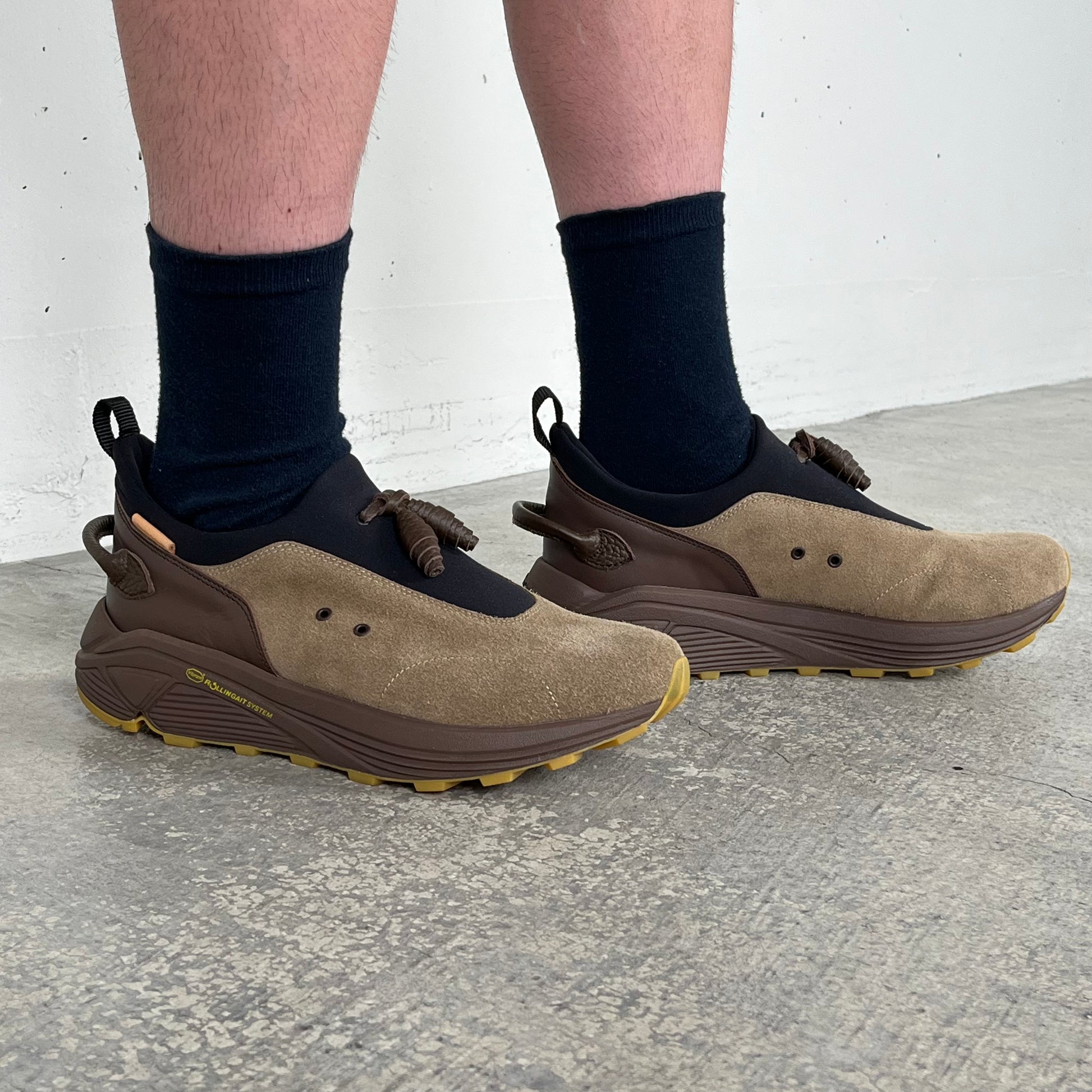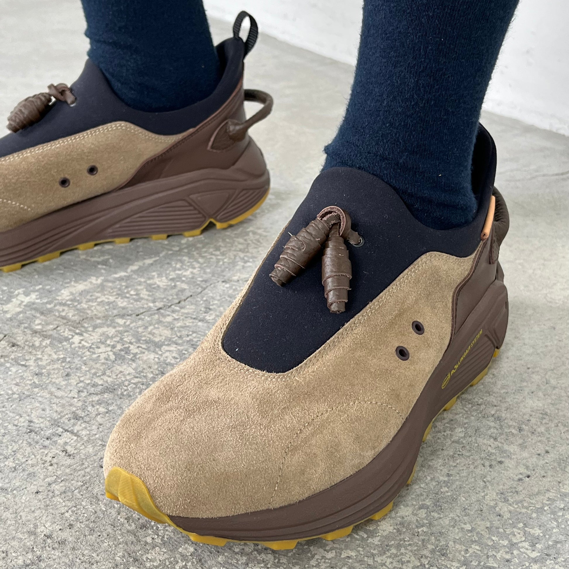 The upper is a combination of water-repellent velour and soft shrink, with a 186c sole made by vibram.