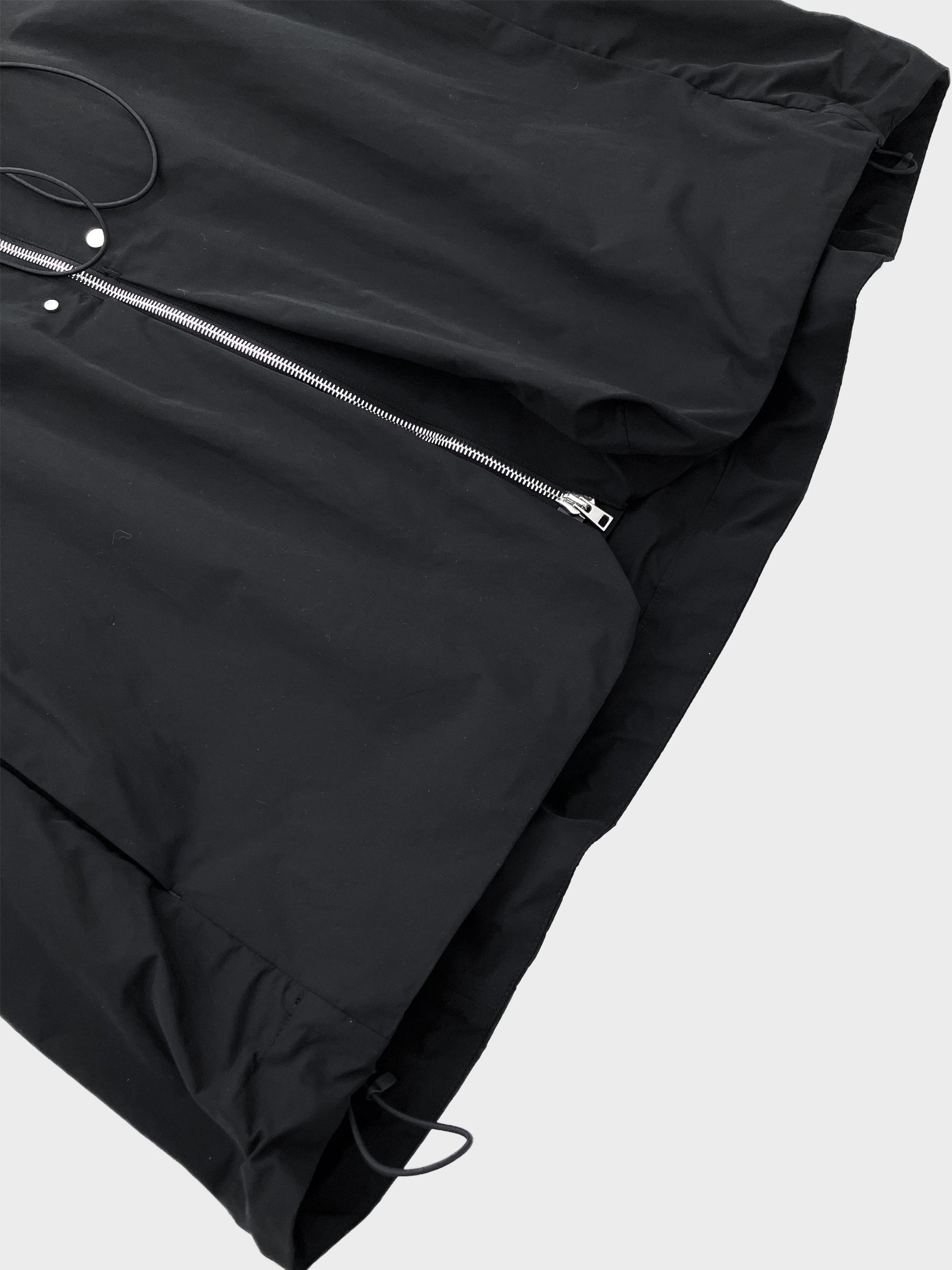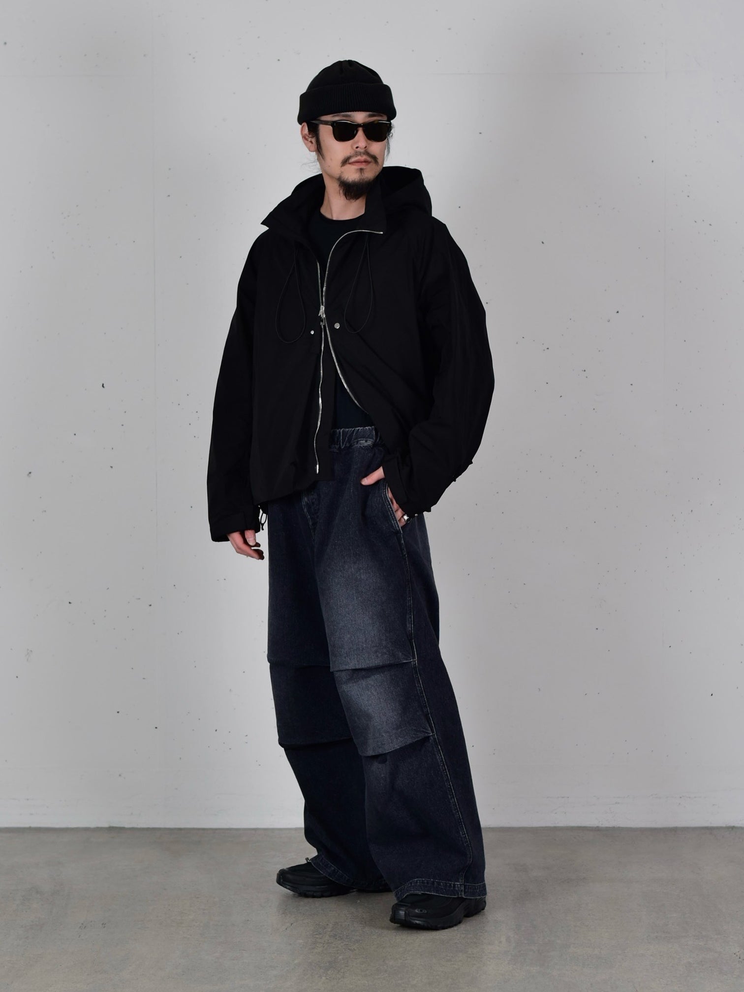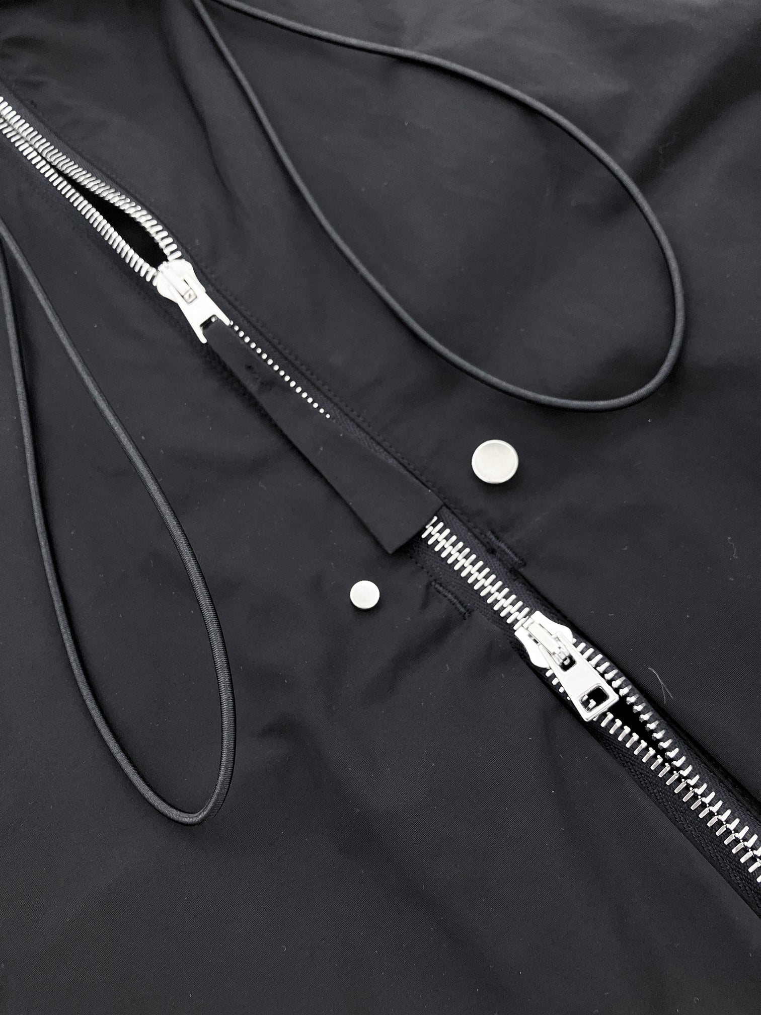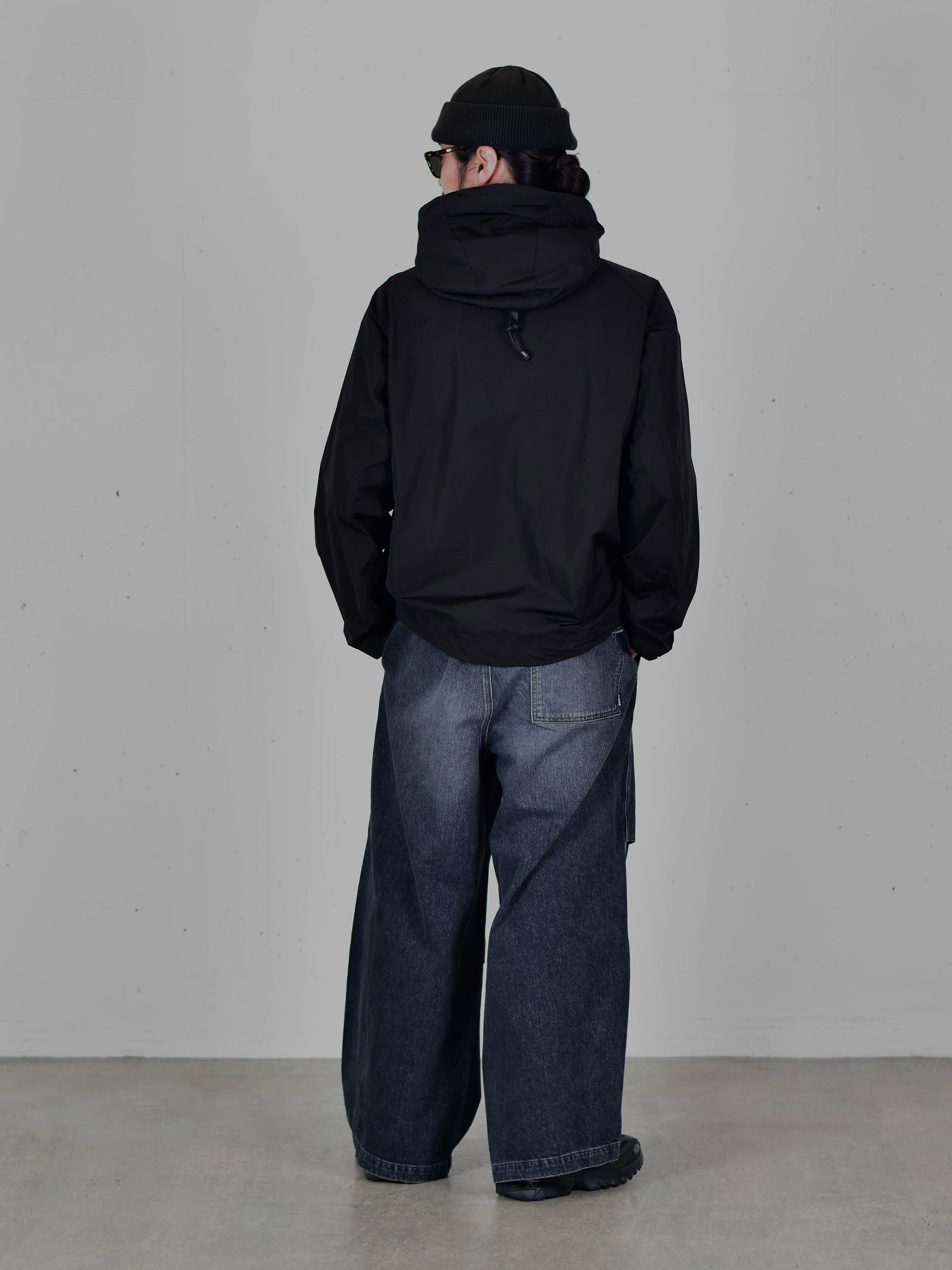 前に1組だけつけられたドットボタンは、ファスナーを使用しなくとも簡単に前を閉じることができ、また腰ポケットは、マチに前あきファスナー付けを行い立体的なシルエットでかつ大容量になっているなどこれらのディテールは機能的であることと同時に、見た目・審美的にも優れたプロダクトになっています。
