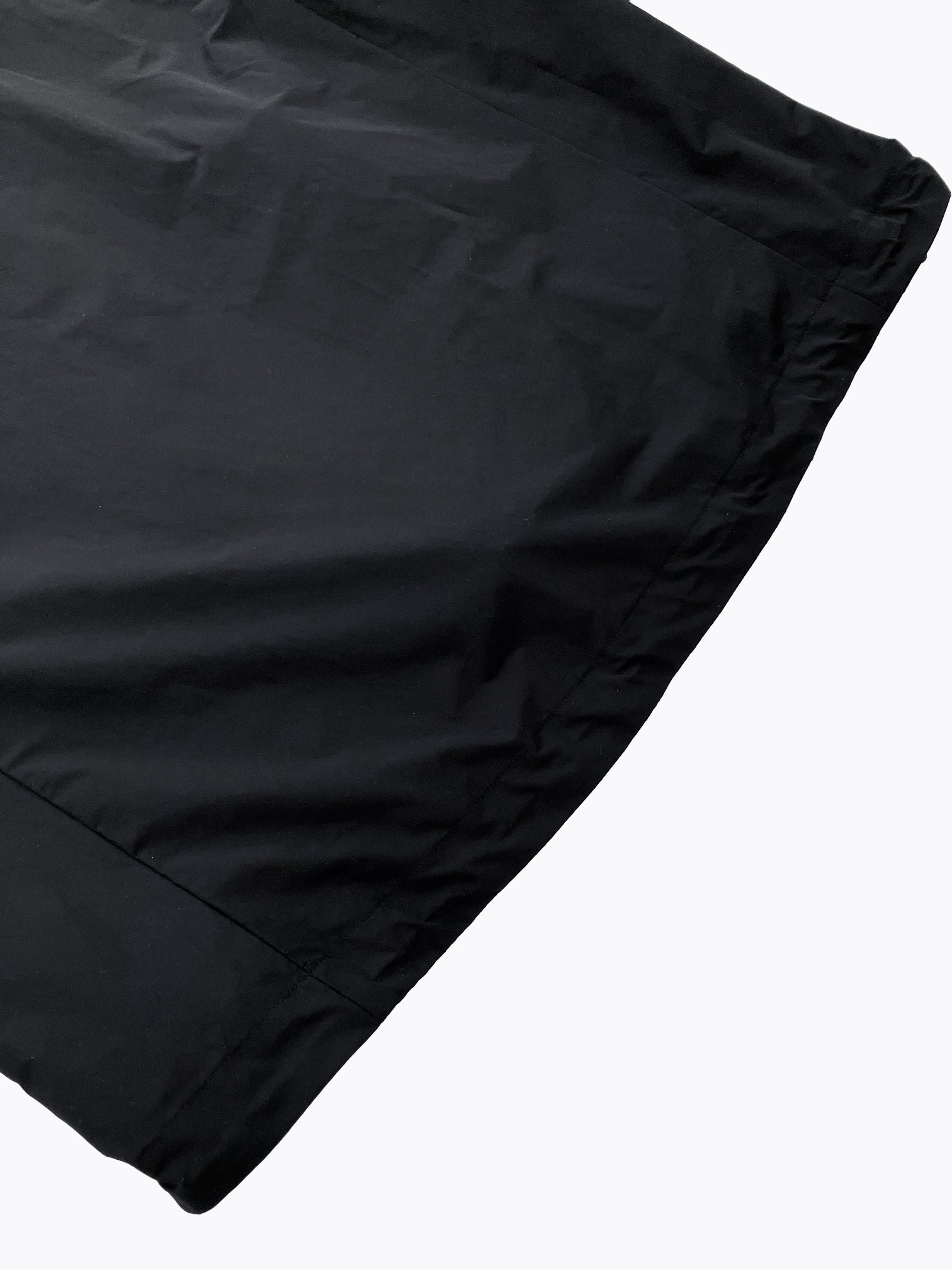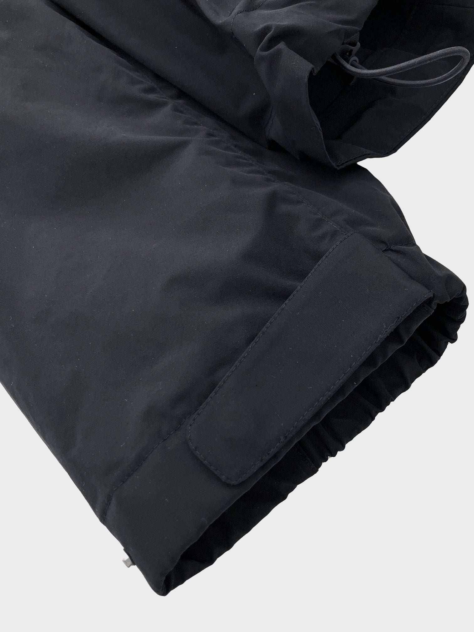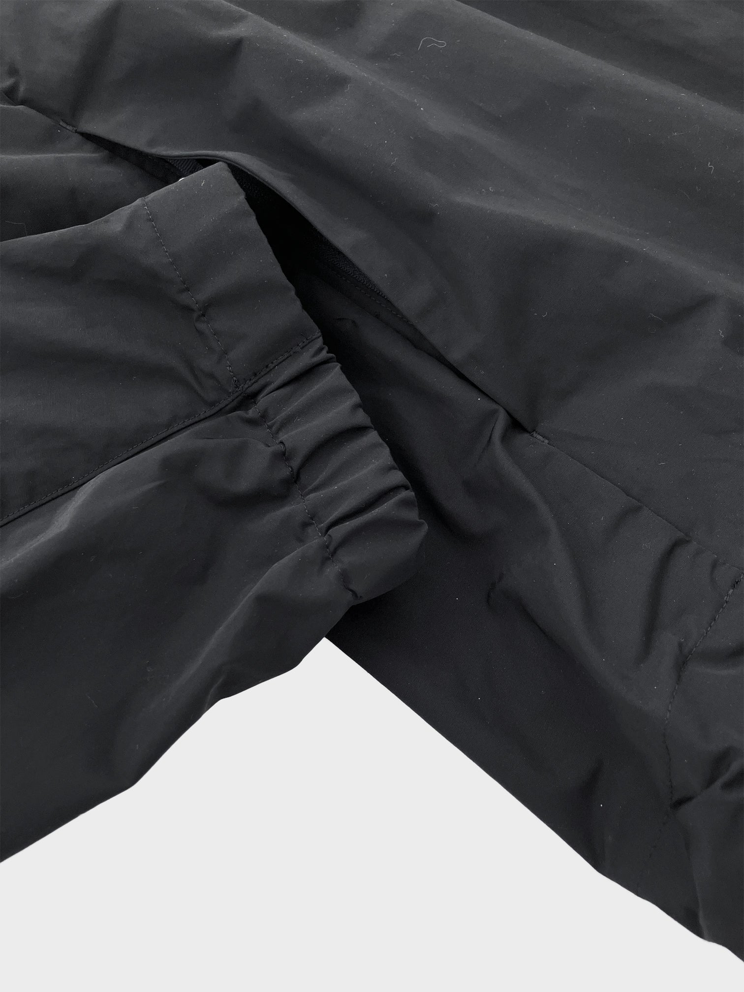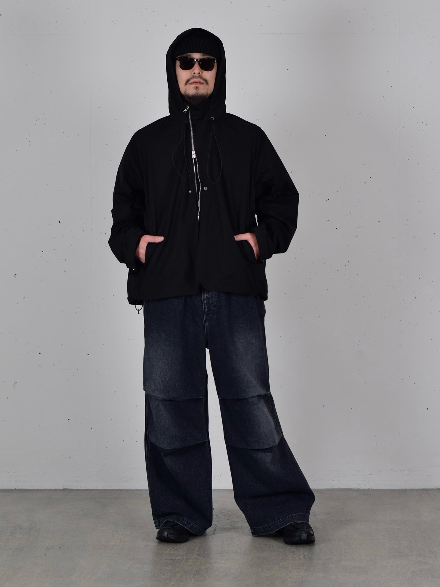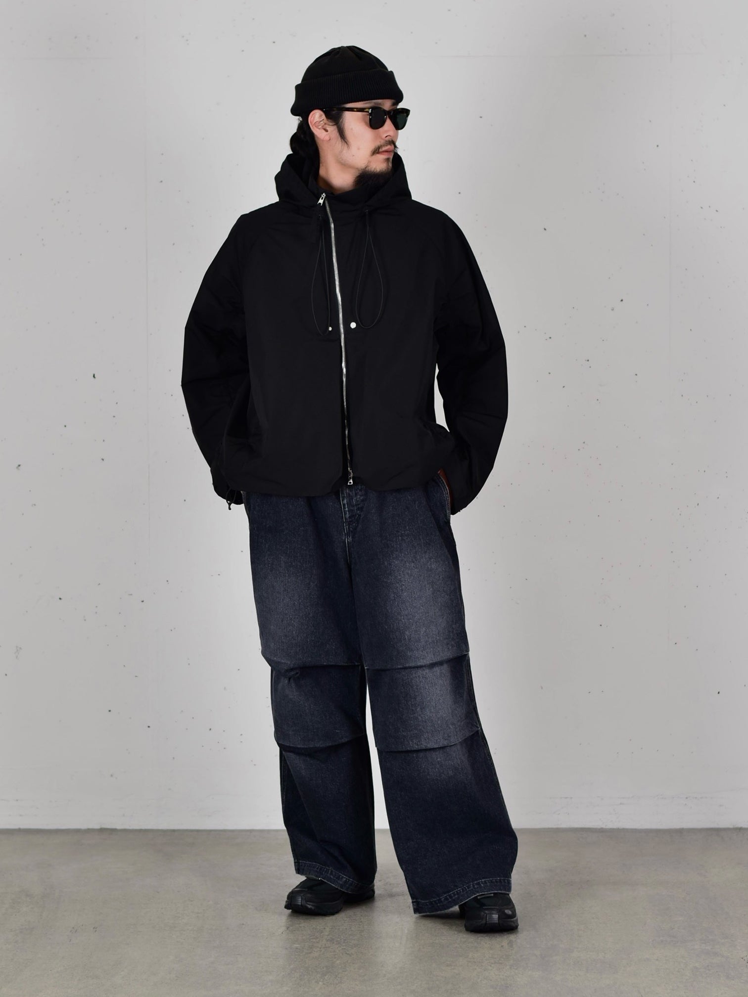 前に1組だけつけられたドットボタンは、ファスナーを使用しなくとも簡単に前を閉じることができ、また腰ポケットは、マチに前あきファスナー付けを行い立体的なシルエットでかつ大容量になっているなどこれらのディテールは機能的であることと同時に、見た目・審美的にも優れたプロダクトになっています。