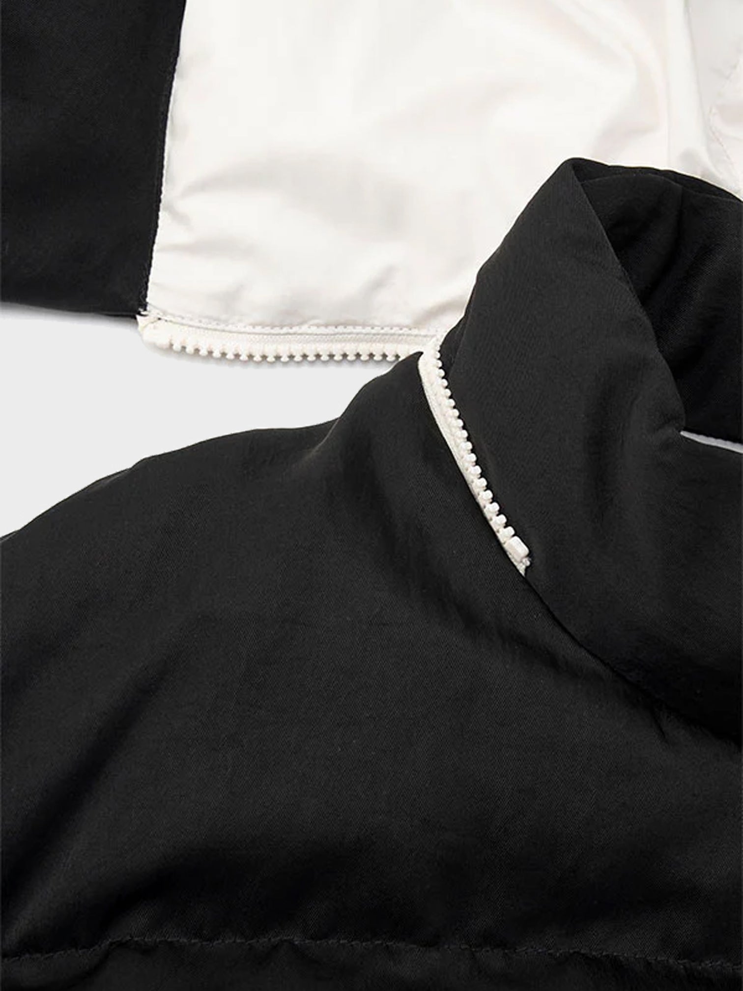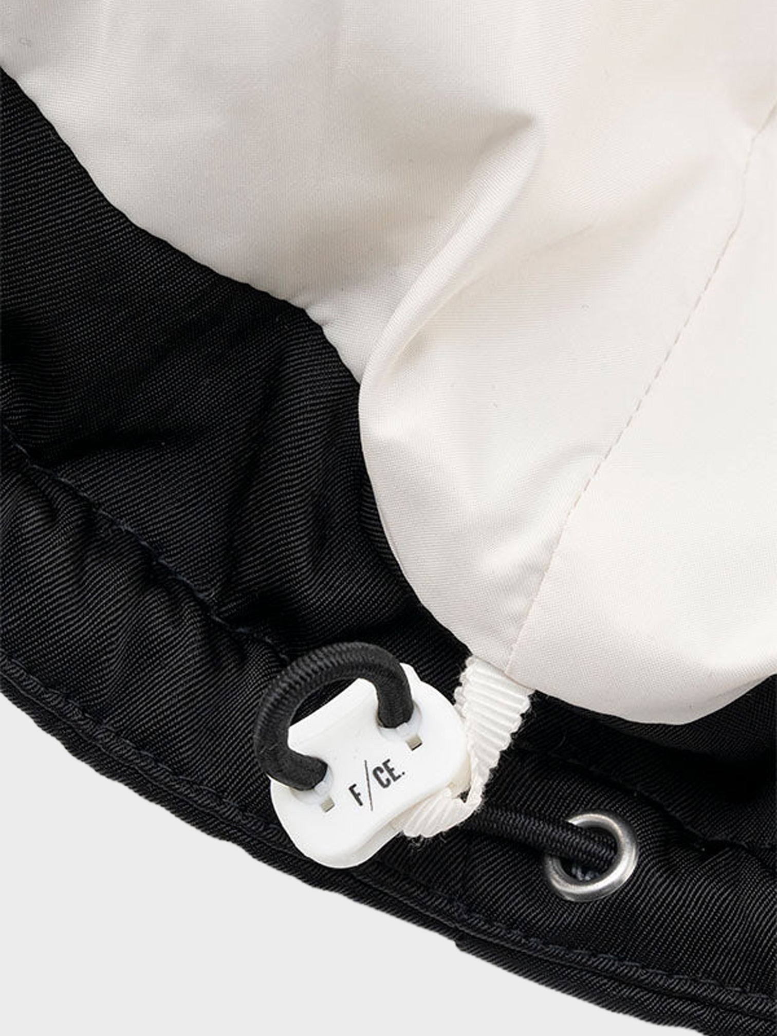 裾のスピンドルでシルエットの調節が可能。ファスナー・引き手・裏地をオフ白の配色がアクセントになっています。