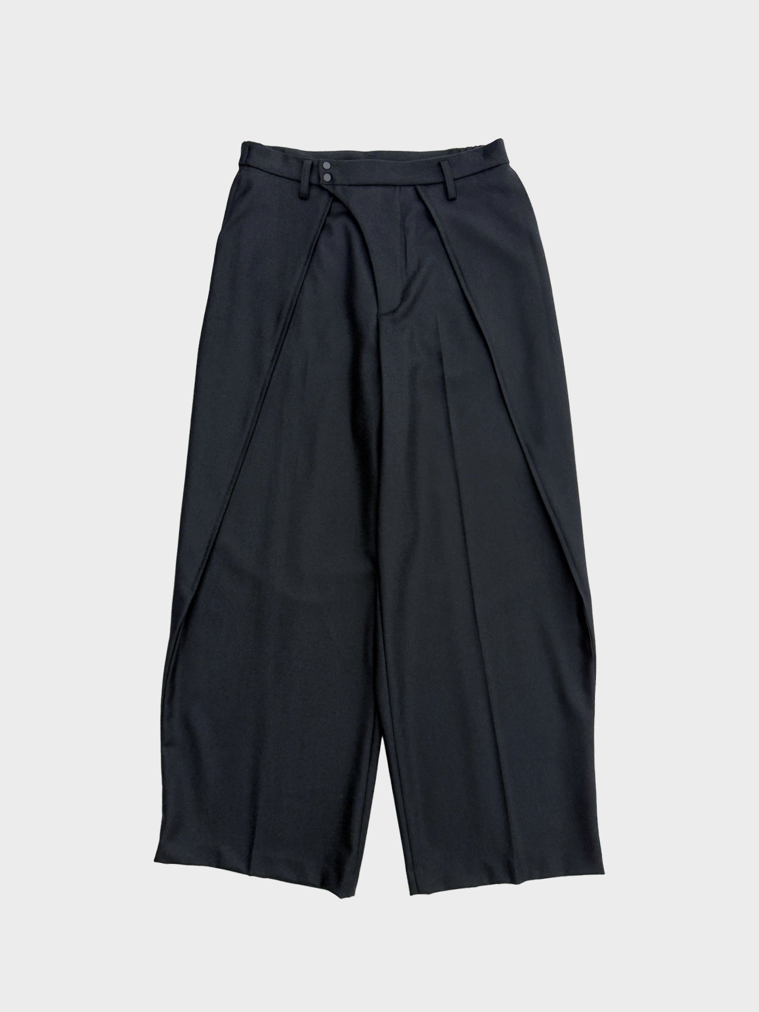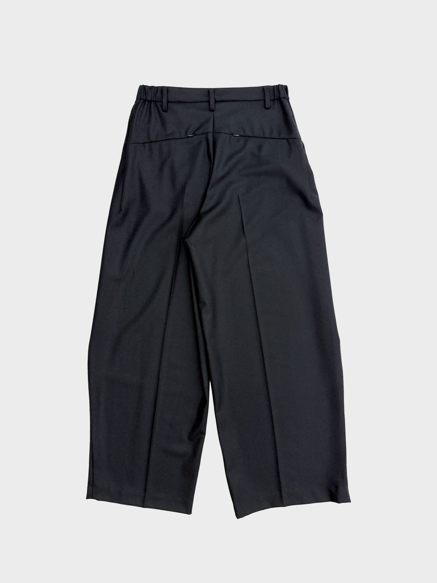 フロントの大きなタックはスカートのように脚を覆うように、ボールドシルエットで作られています。後ろウエスト左右にゴムを用いた伸縮構造でストレスなく着脱可能です。
