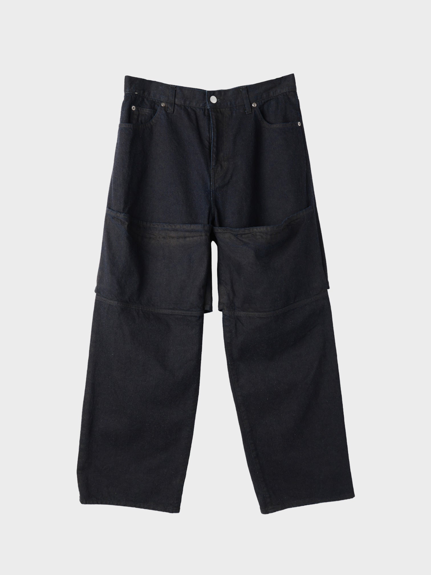ルーズフィットのストレートシルエットとなっており、裾を裏返して穿ける仕様となっています。通常時は膝上まで生地が一枚重なっており、裏返すとフロントの膝にスリットができる仕様となっています。