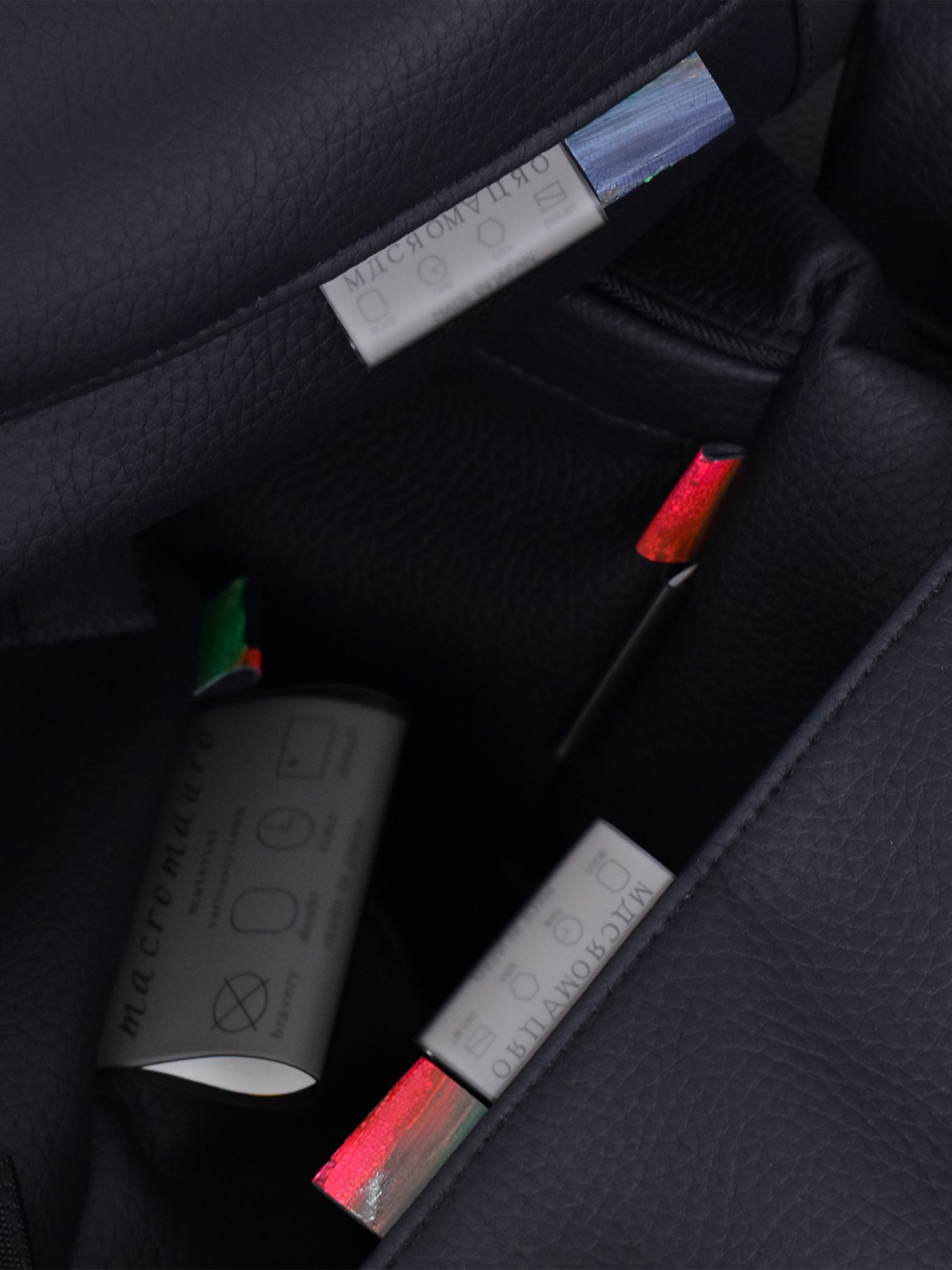 ピスネームにはmacromauroの代表作である、paintシリーズよりエナメルブラックレザーを使用。ブランドネームを見ずともどこのブランドかが一目でわかるよう、贅沢にも往年の名作生地を素材に用いています。またブランドタグに被せられるカバーは通常ホワイトクリアのPVC素材となりますが、このSUPER BLACKではブラッククリアのPVCが使われています。更には通常のALBERTONでは、裏地がグリーンになりますが、ブラックに色変更をしています。