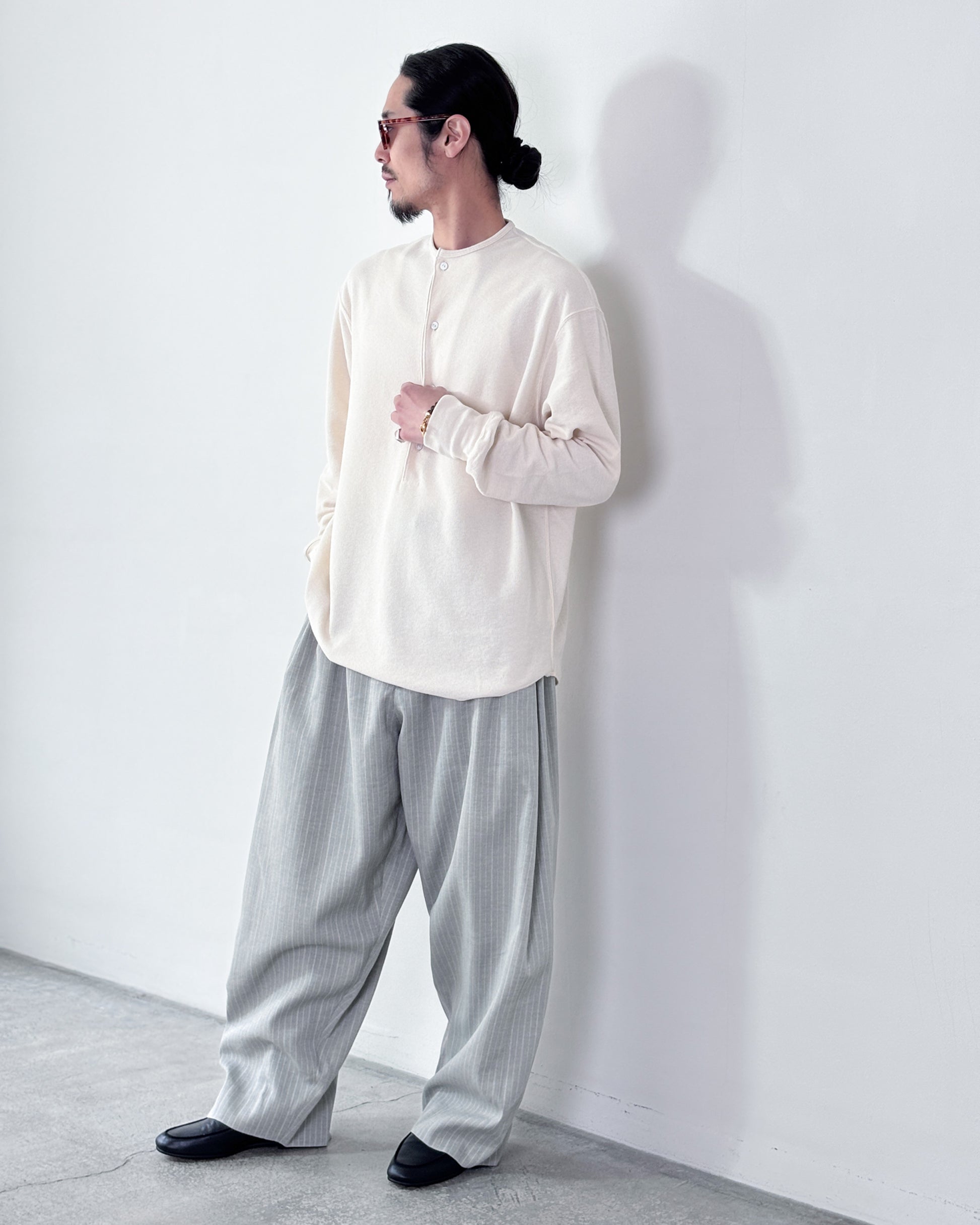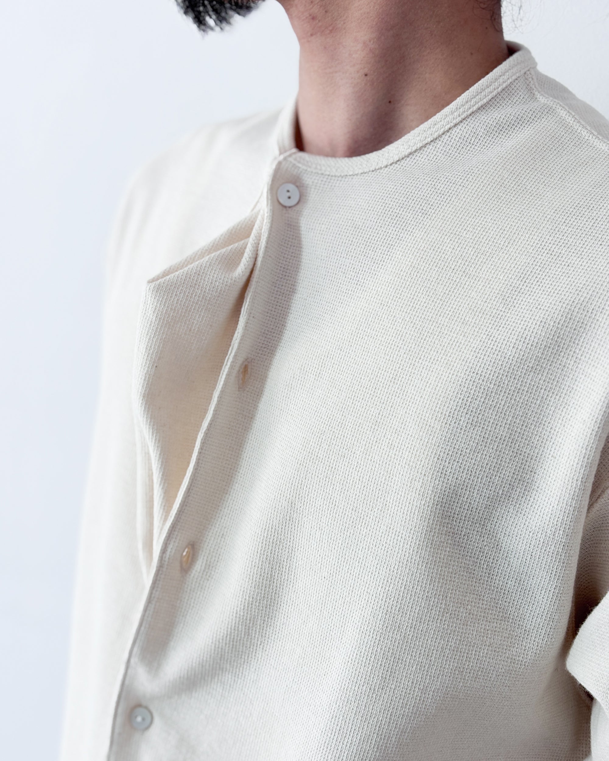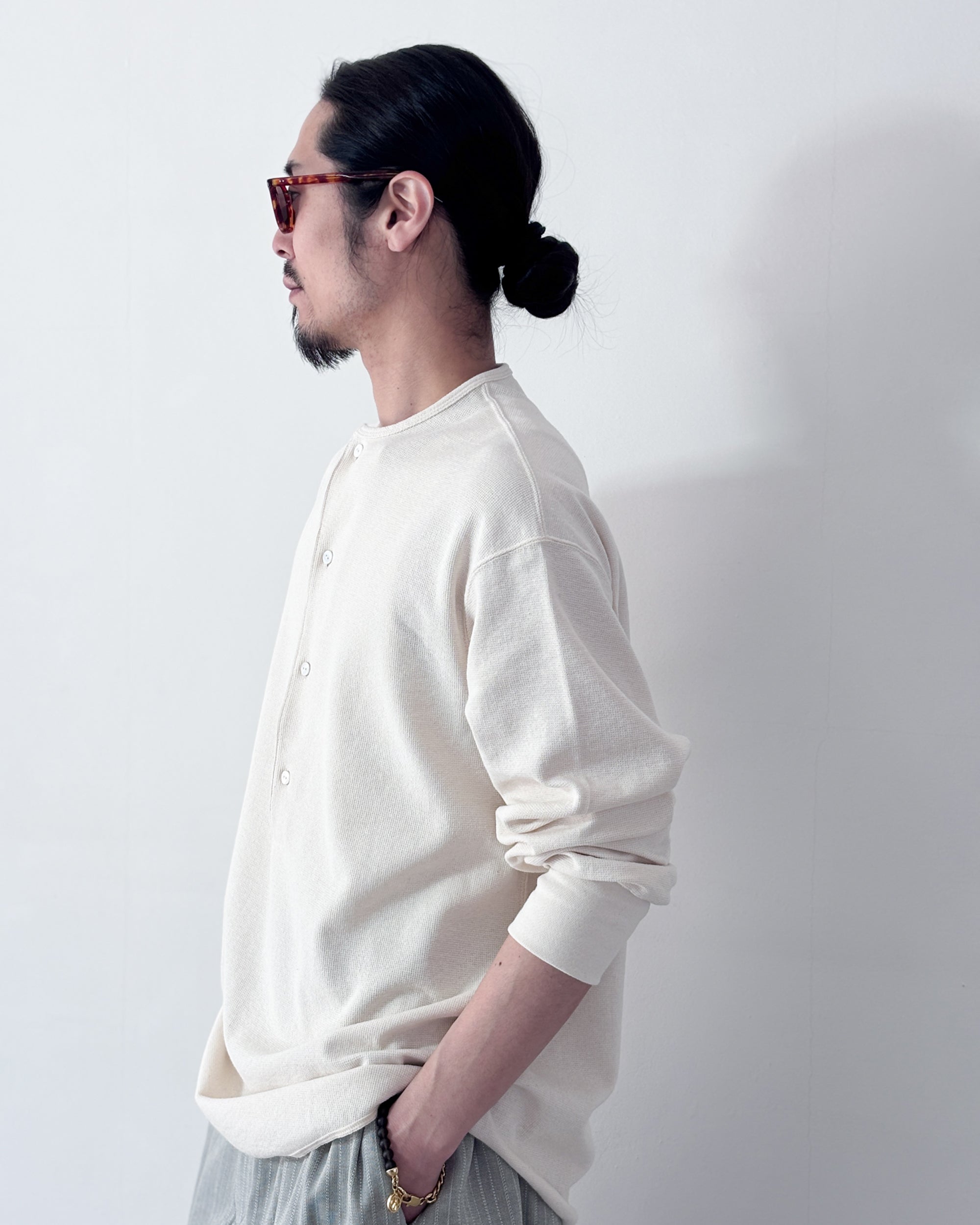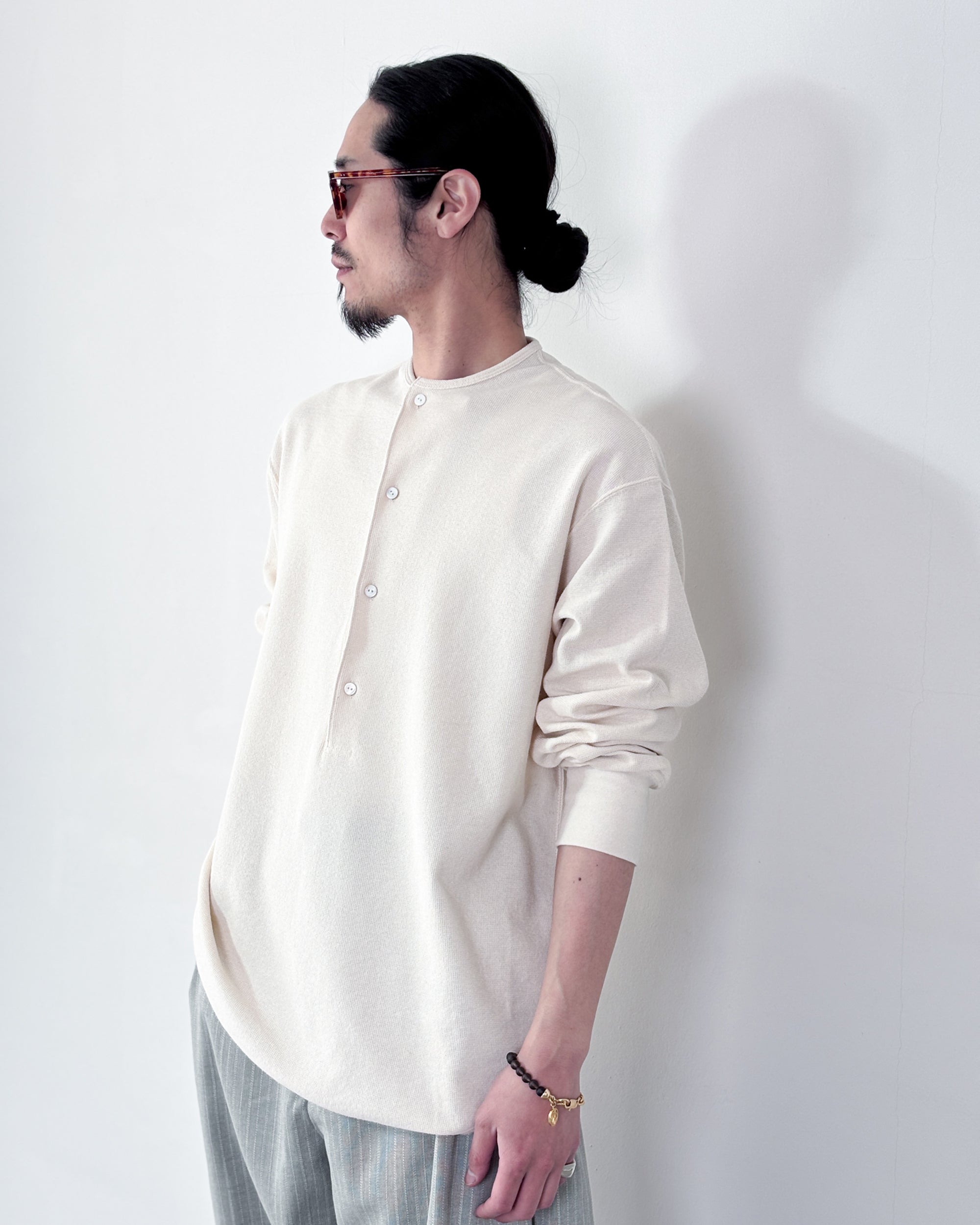【4月18日(土)12:00販売開始】SOSHIOTSUKI / DRAPED PLACKET THERMAL TEE (BEIGE)