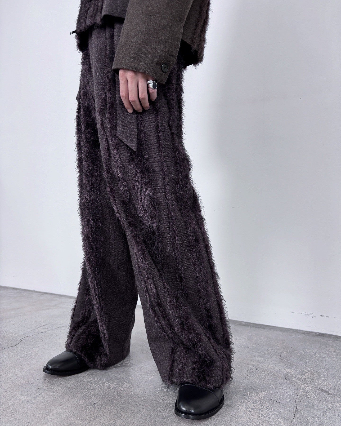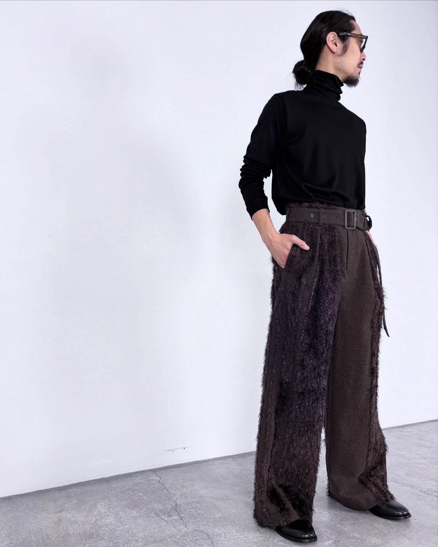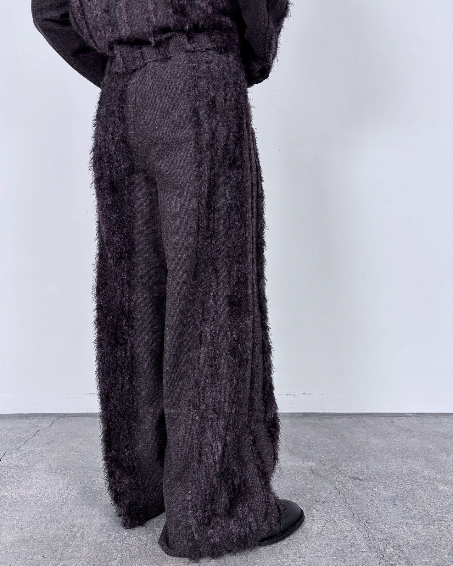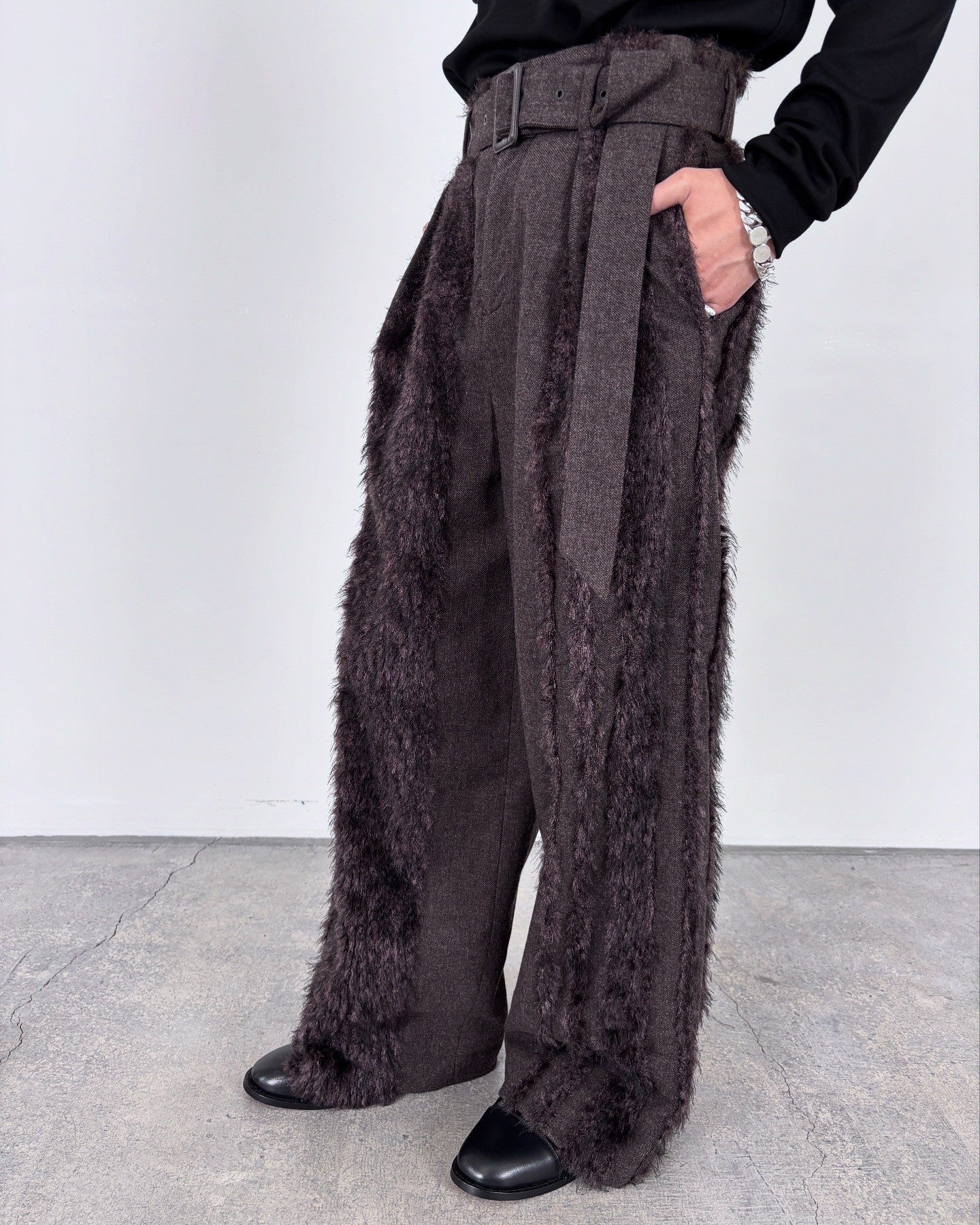 ウールツイードとフェイクファー、二つの要素を一緒に織り込んだ生地を用いて製作したベルド付きワイドスラックスです。