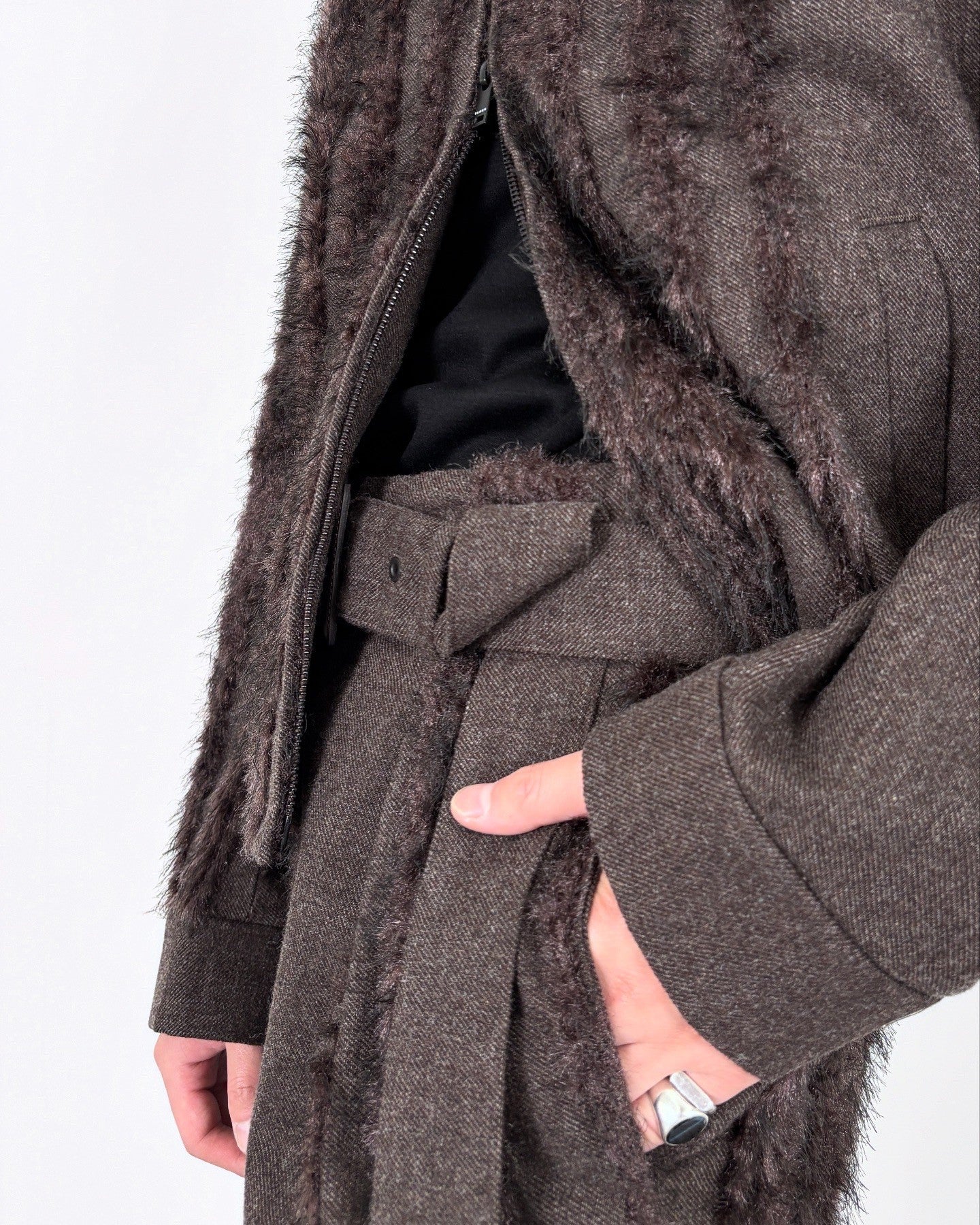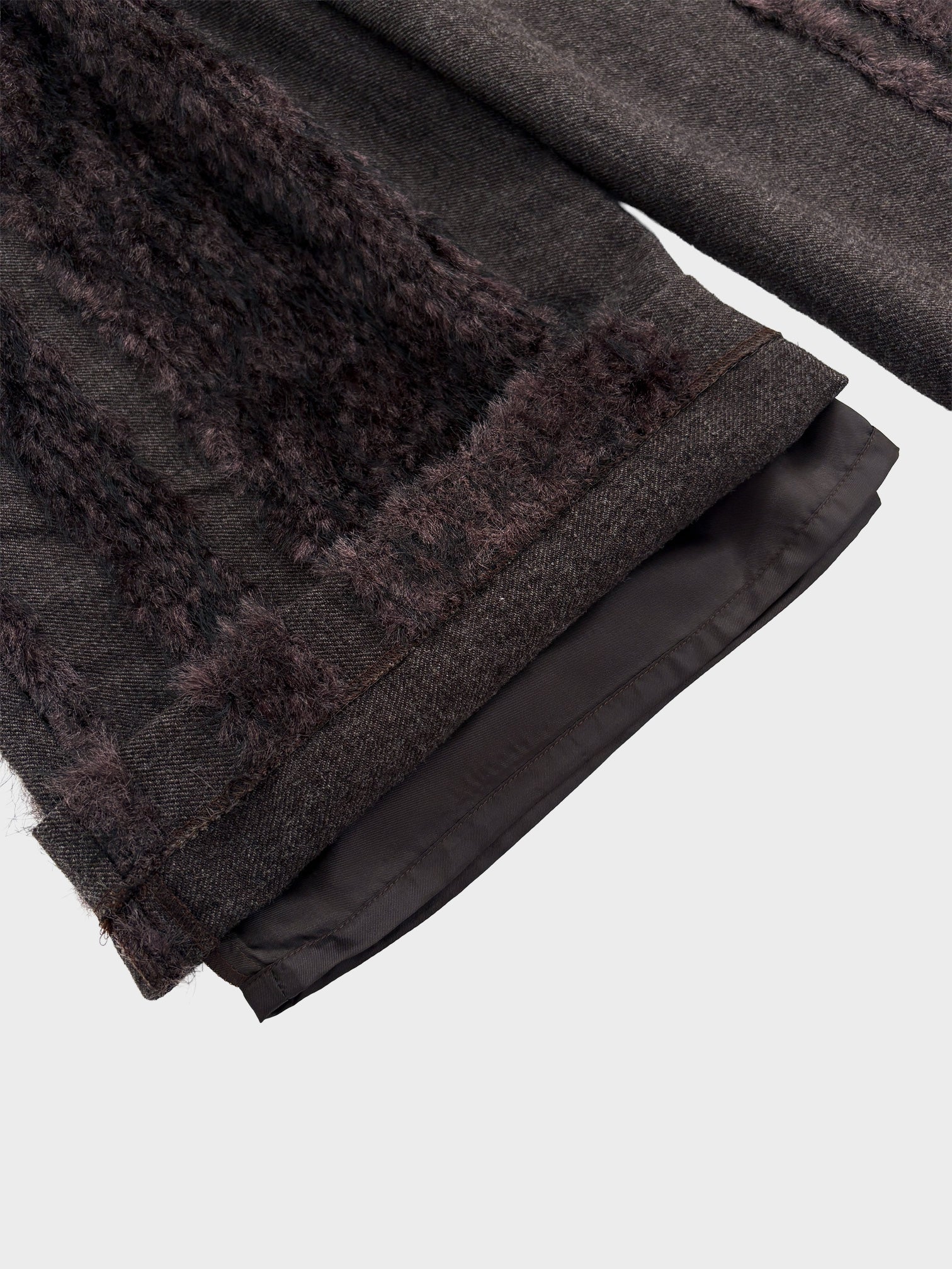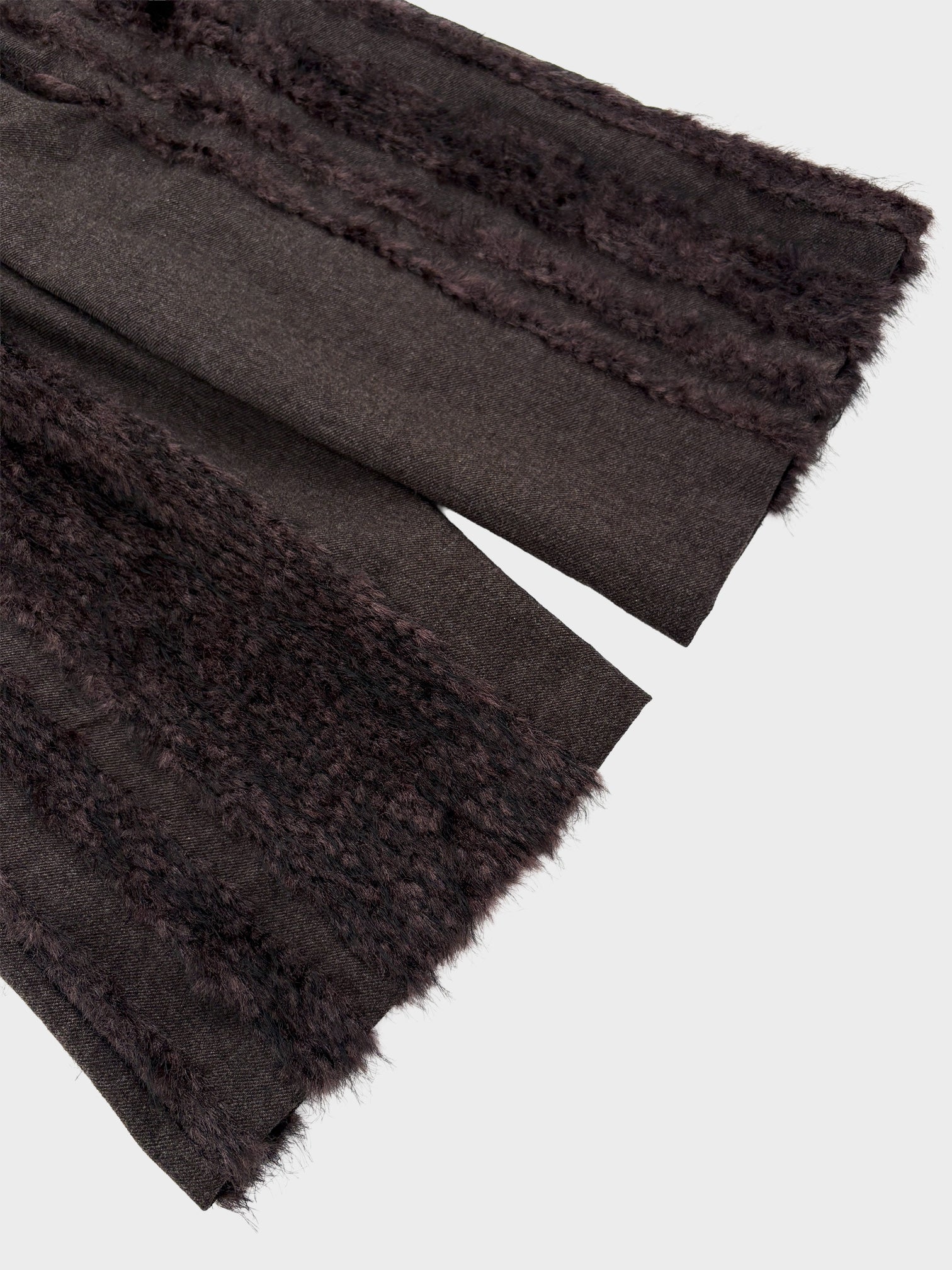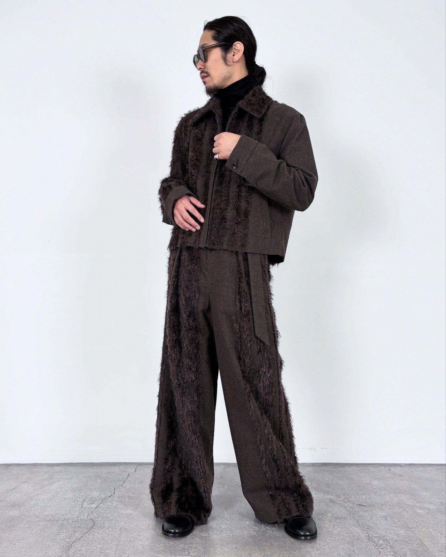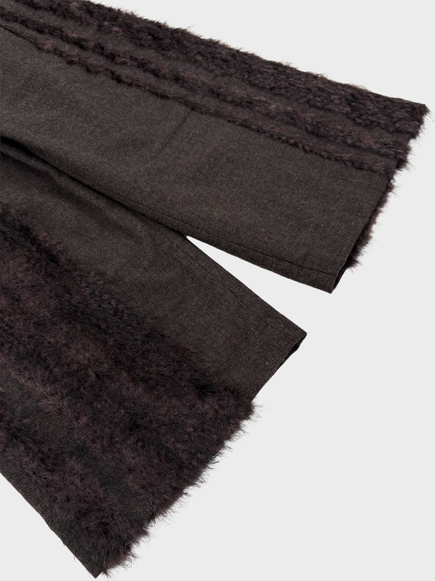 ウールツイードとフェイクファー、二つの要素を一緒に織り込んだ生地を用いて製作したベルド付きワイドスラックスです。
