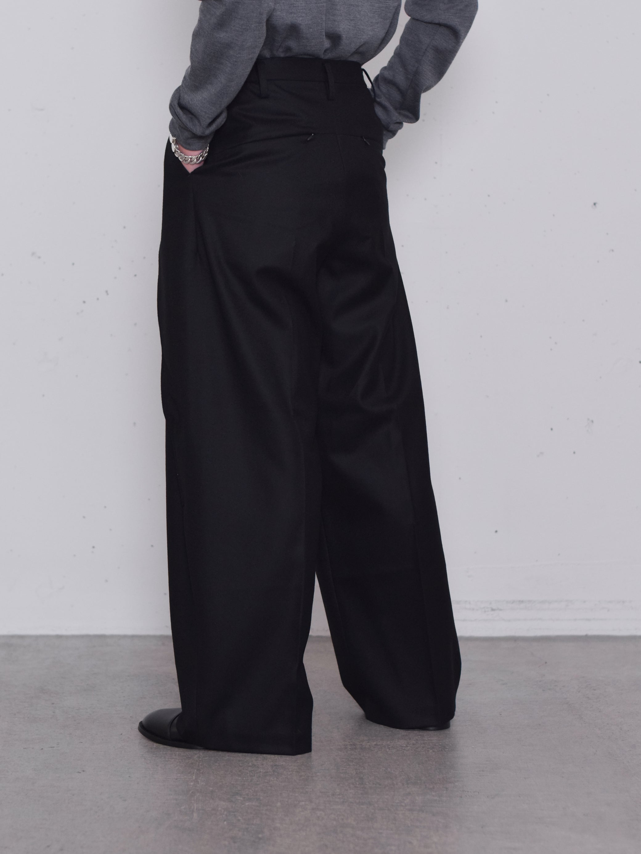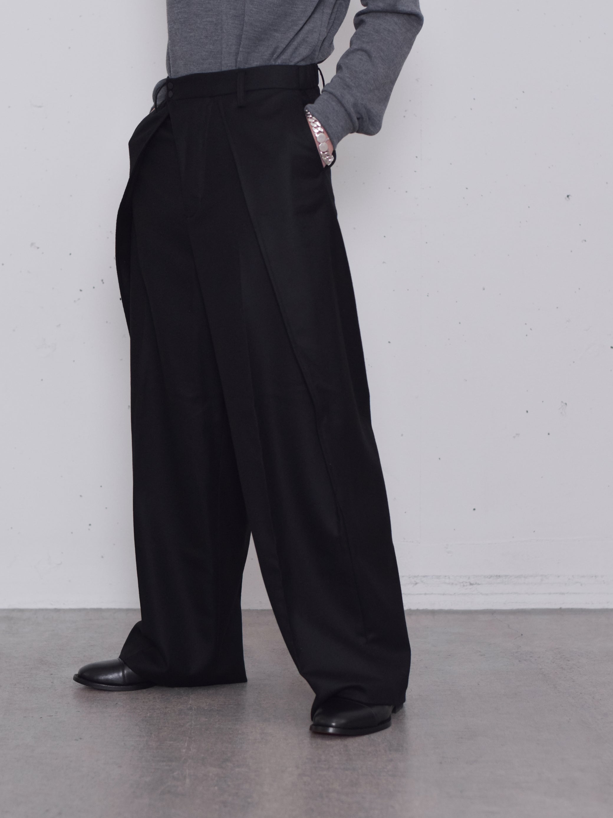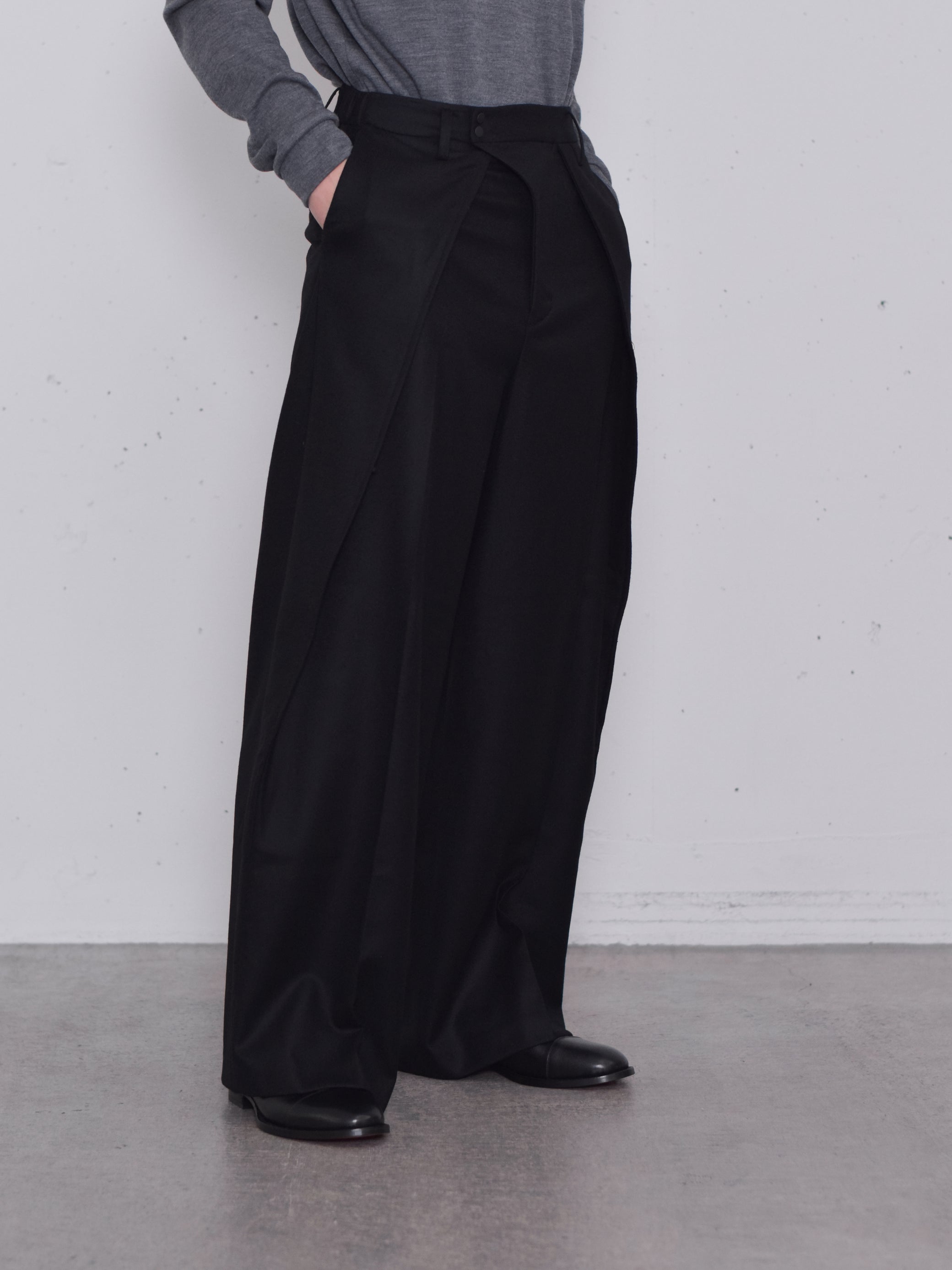 フロントの大きなタックはスカートのように脚を覆うように、ボールドシルエットで作られています。後ろウエスト左右にゴムを用いた伸縮構造でストレスなく着脱可能です。