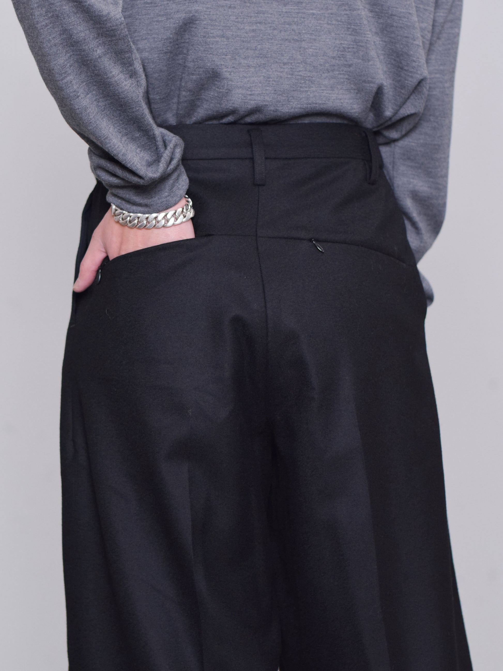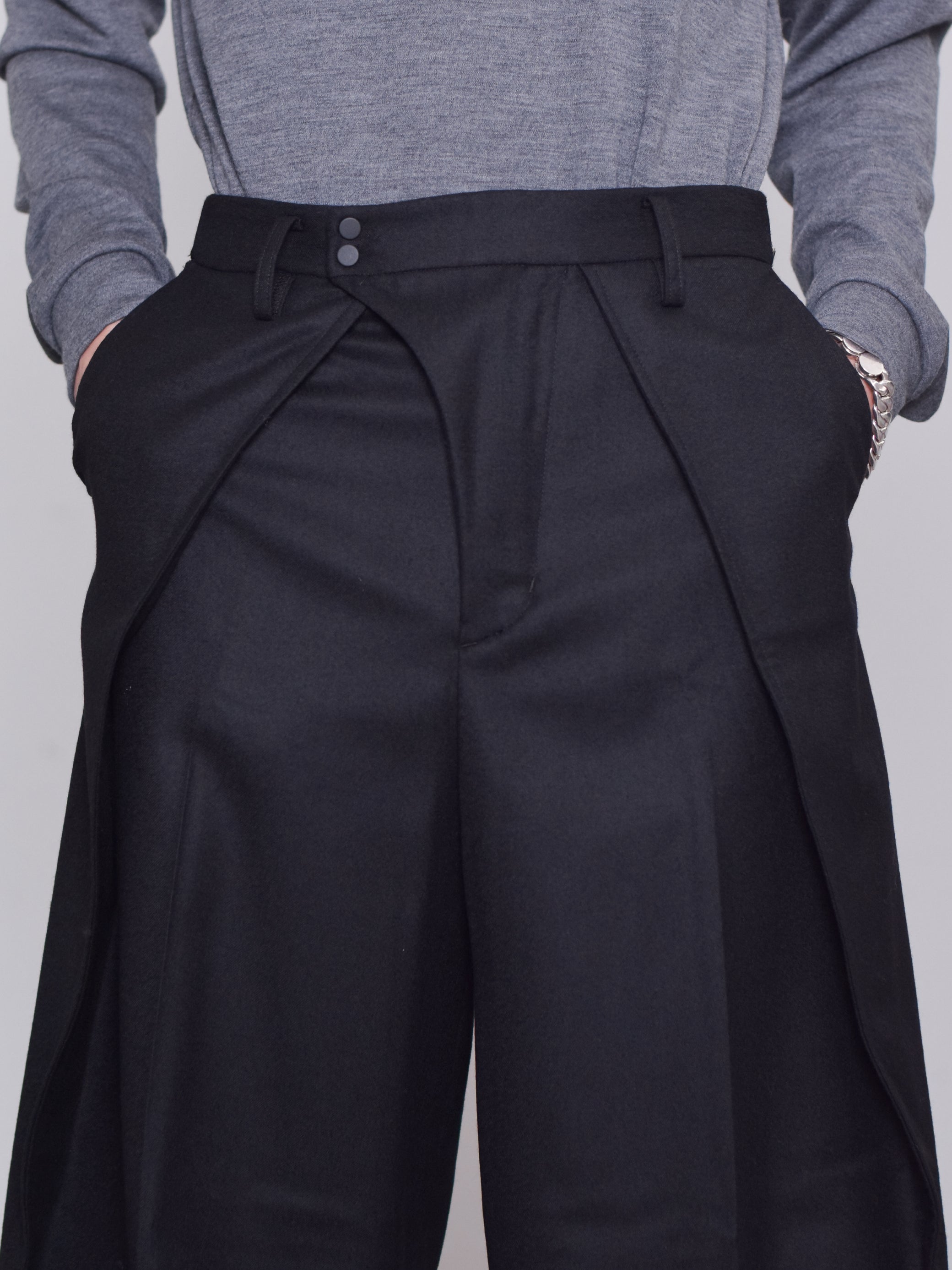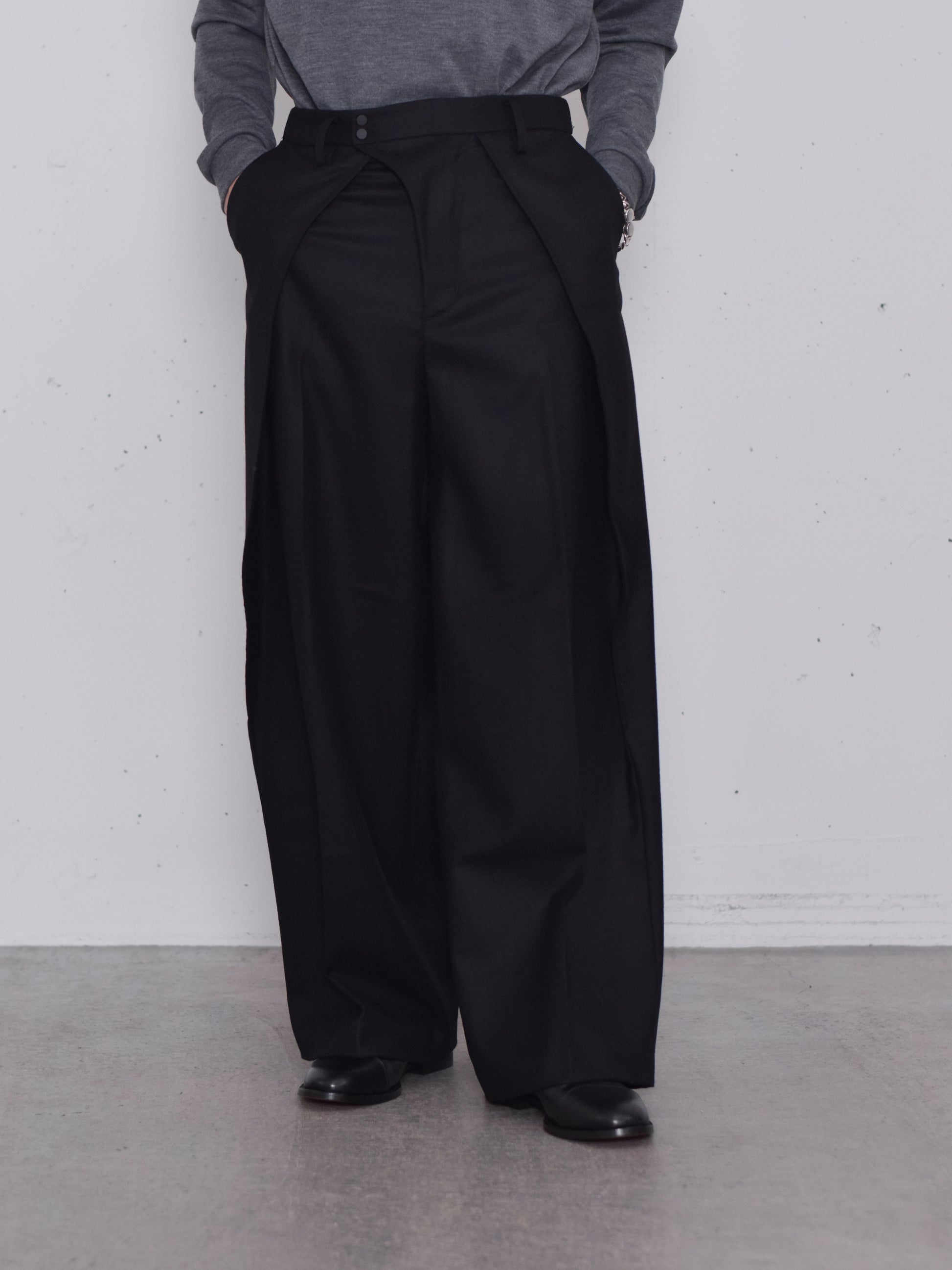 フロントの大きなタックはスカートのように脚を覆うように、ボールドシルエットで作られています。後ろウエスト左右にゴムを用いた伸縮構造でストレスなく着脱可能です。