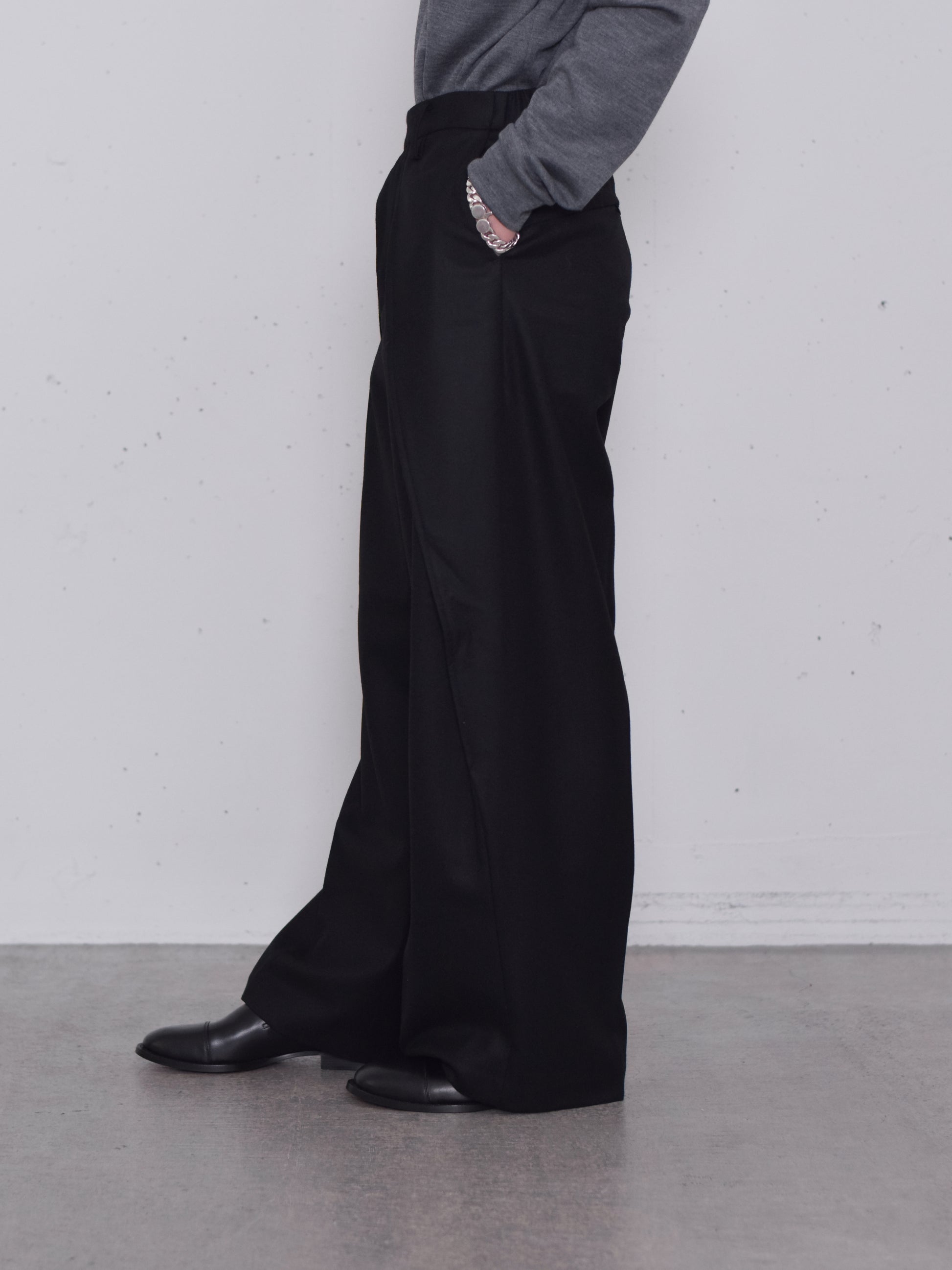 フロントから見た時にイージーパンツという印象を一切与えない先鋭的なデザインです。