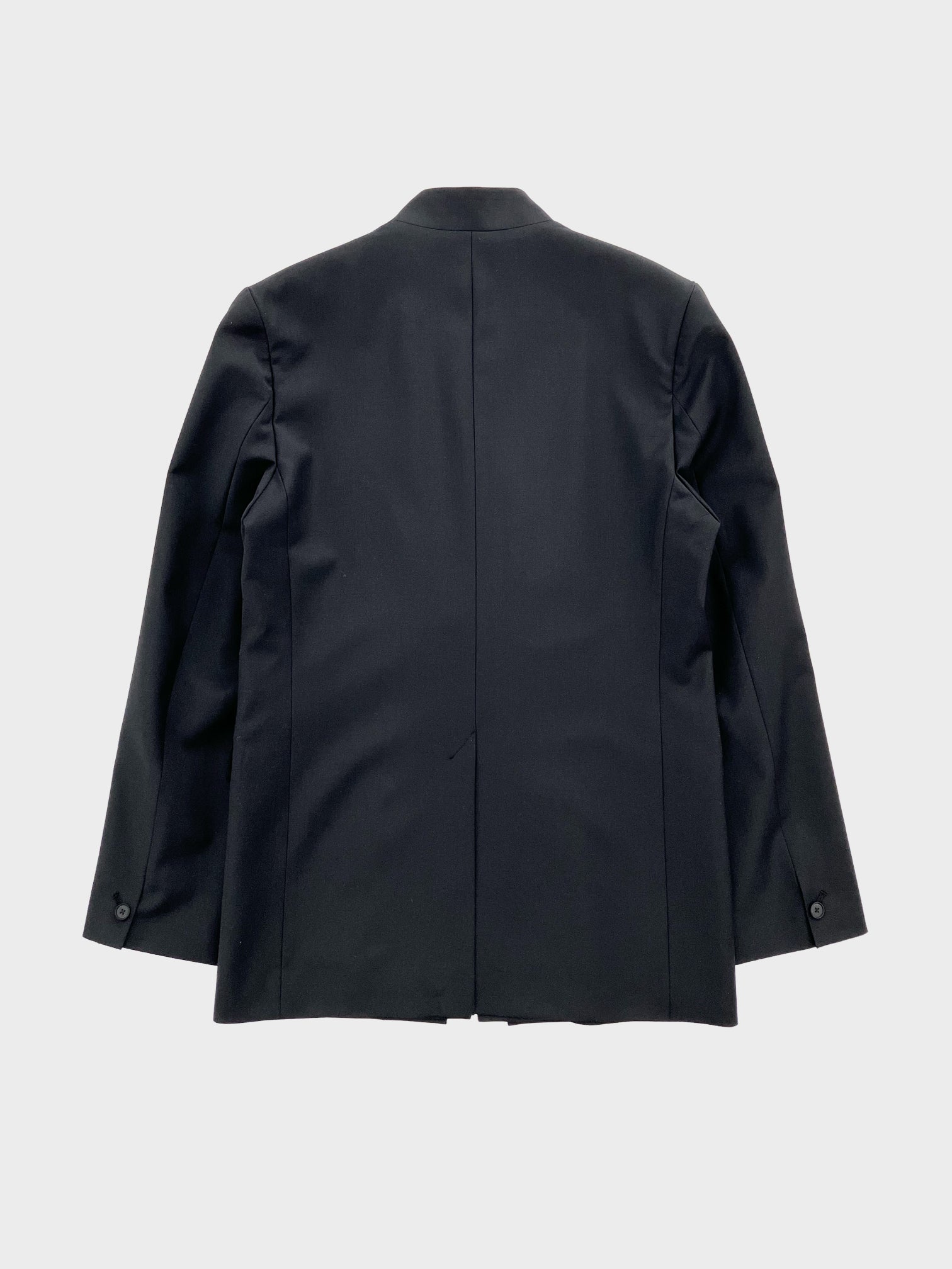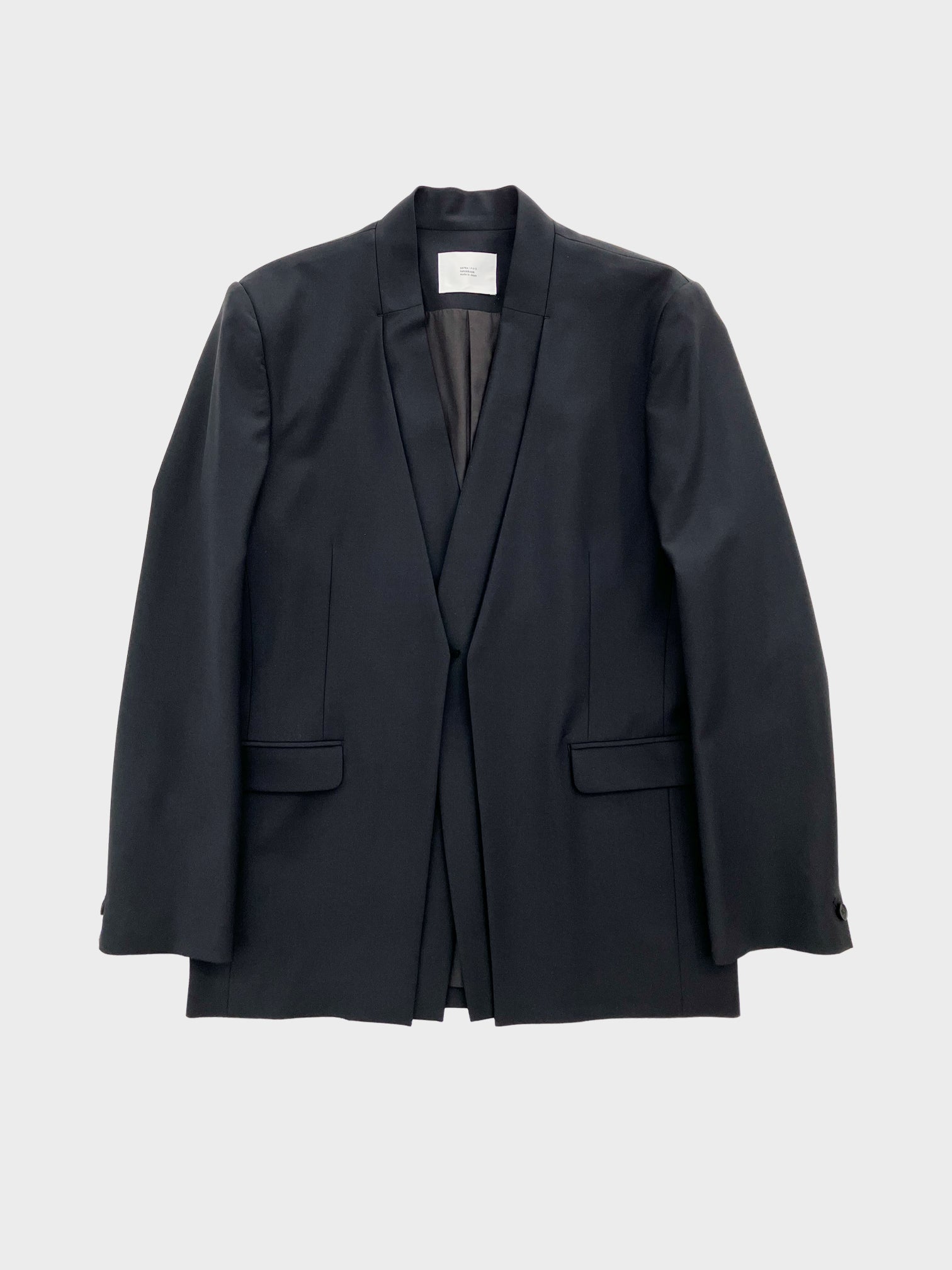 ラペルレスなジャケットとなり、首元がすっきりとした印象を与えます。