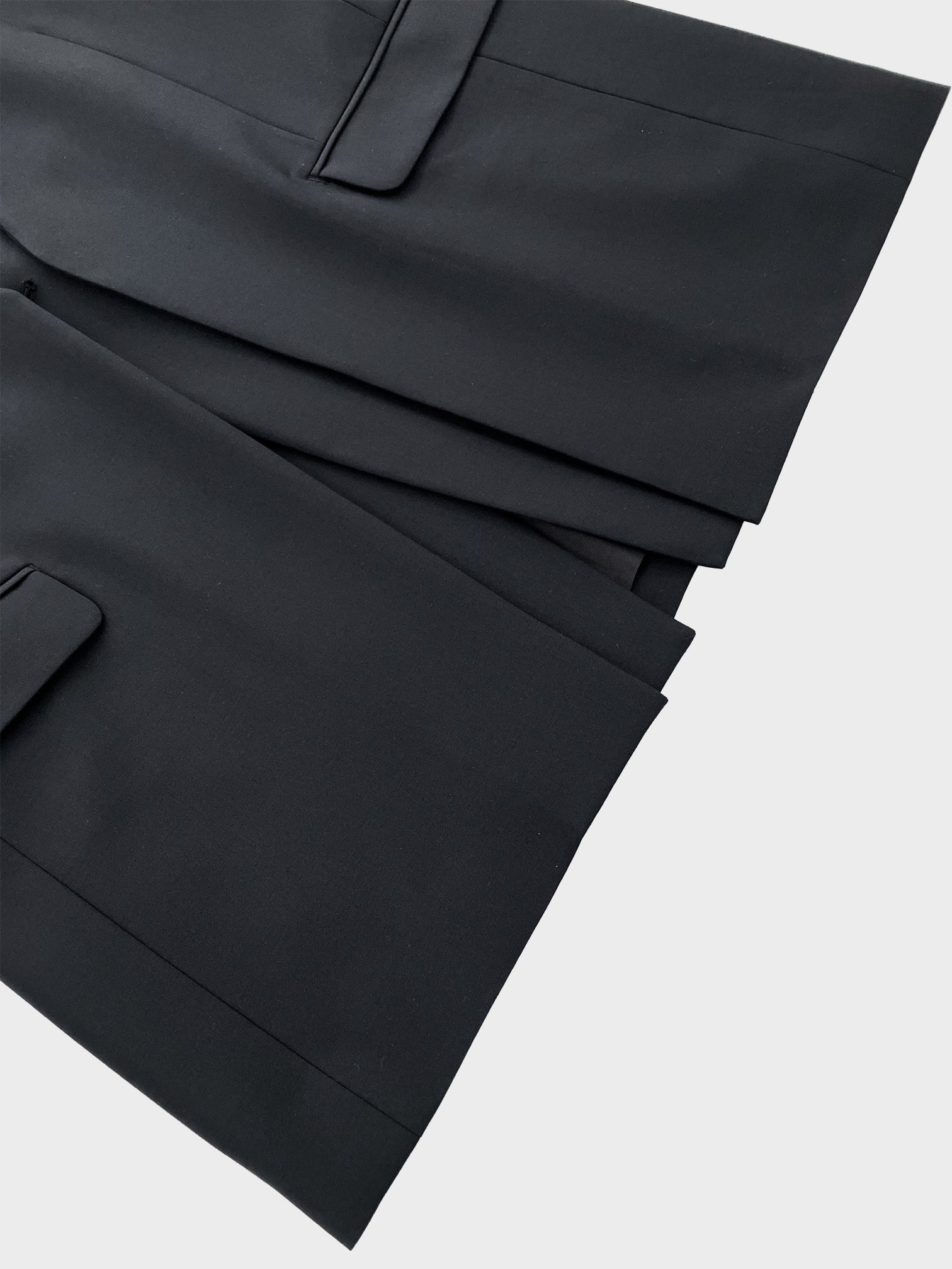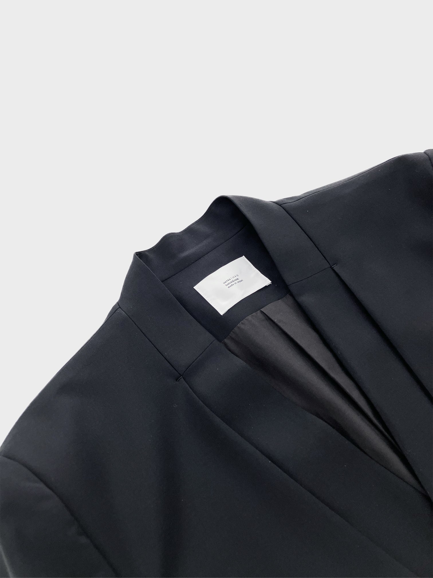 ラペルラインをなぞるレイヤードフラップが特徴的なジャケットとなり、上質な生地感も相まってエレガントさが漂う一着となります。